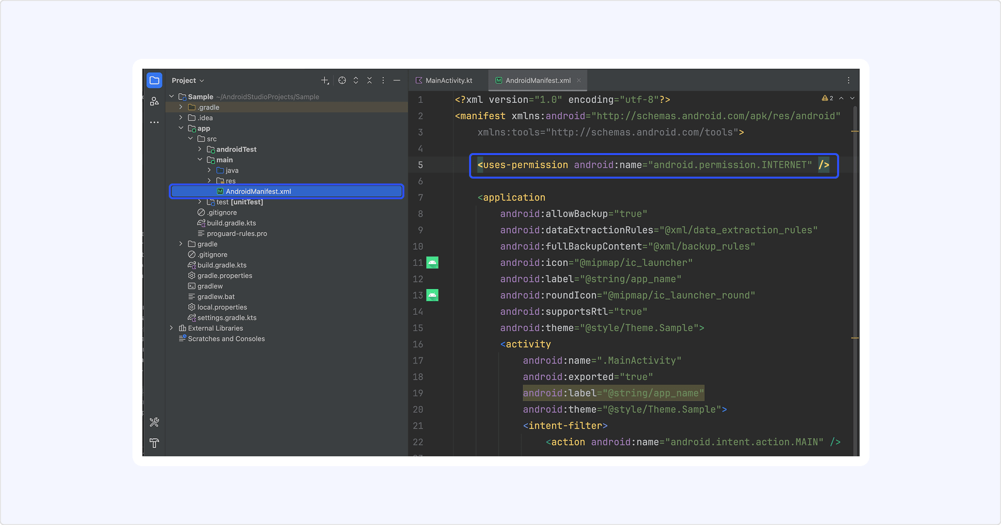 <manifest xmlns:android="http://schemas.android.com/apk/res/android"package="com.example.sample"><!-- Allow Internet permission --><uses-permission android:name="android.permission.INTERNET" /><applicationandroid:allowBackup="true"android:icon="@mipmap/ic_launcher"...