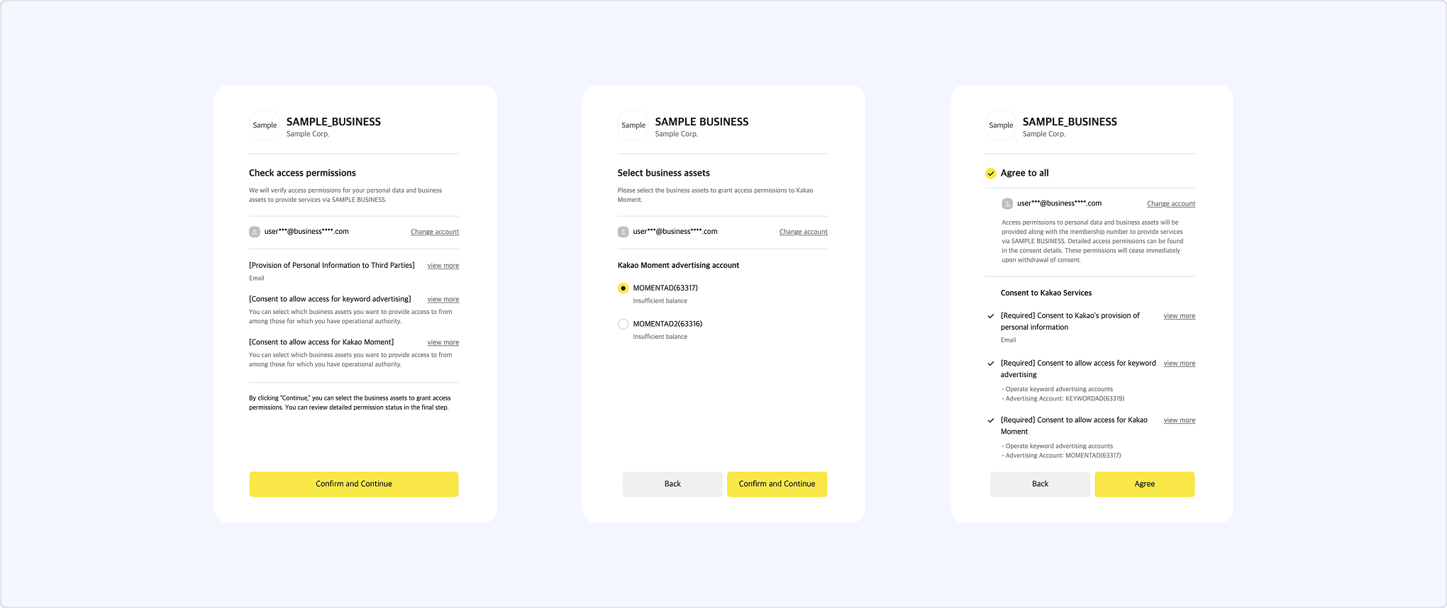 - The Business consent screen with the specified consent items is displayed to the user.