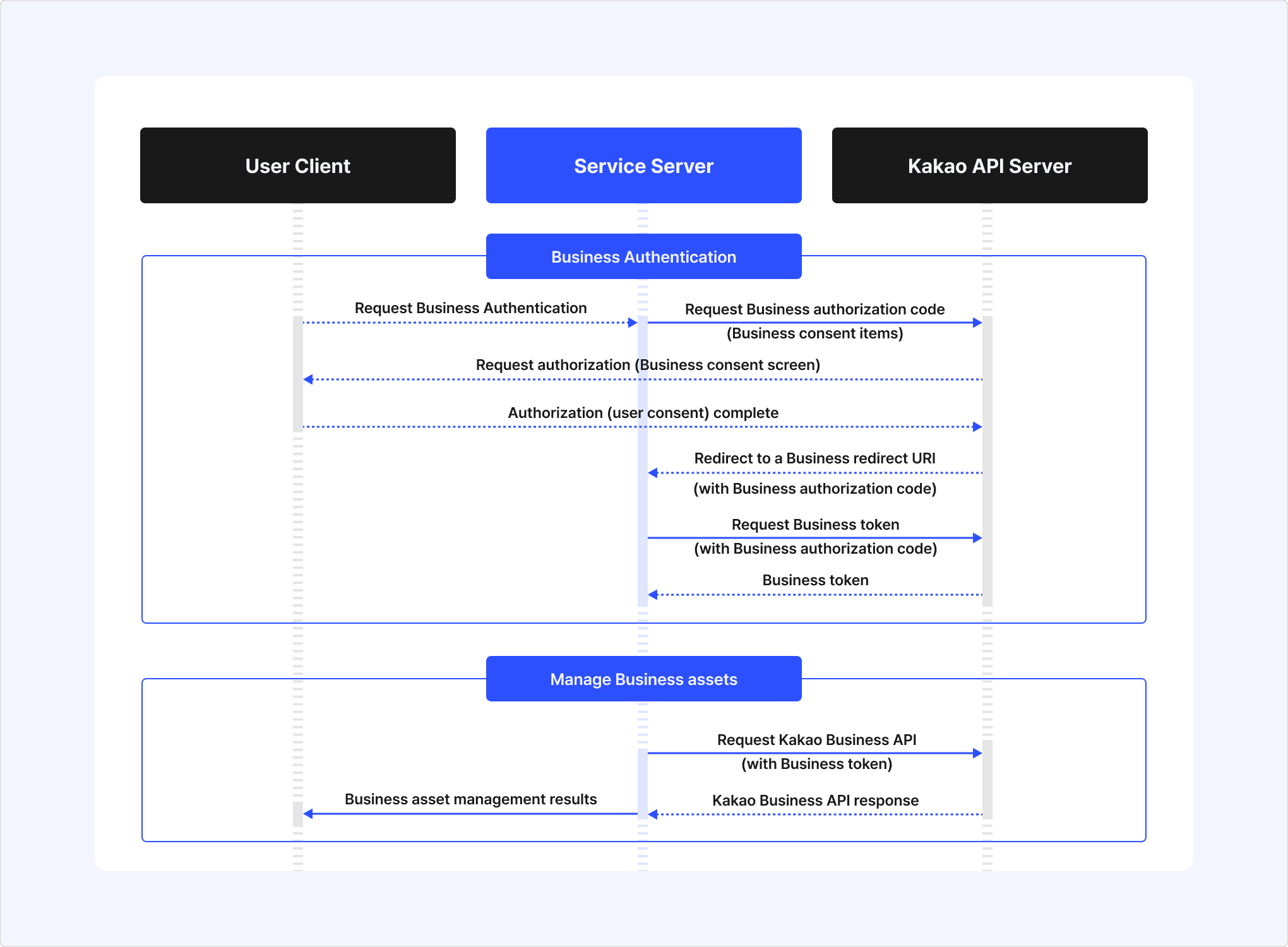 - If the user agrees to the consent screen, the Kakao API server sends the business authorization code to the service via the Business redirect URI.