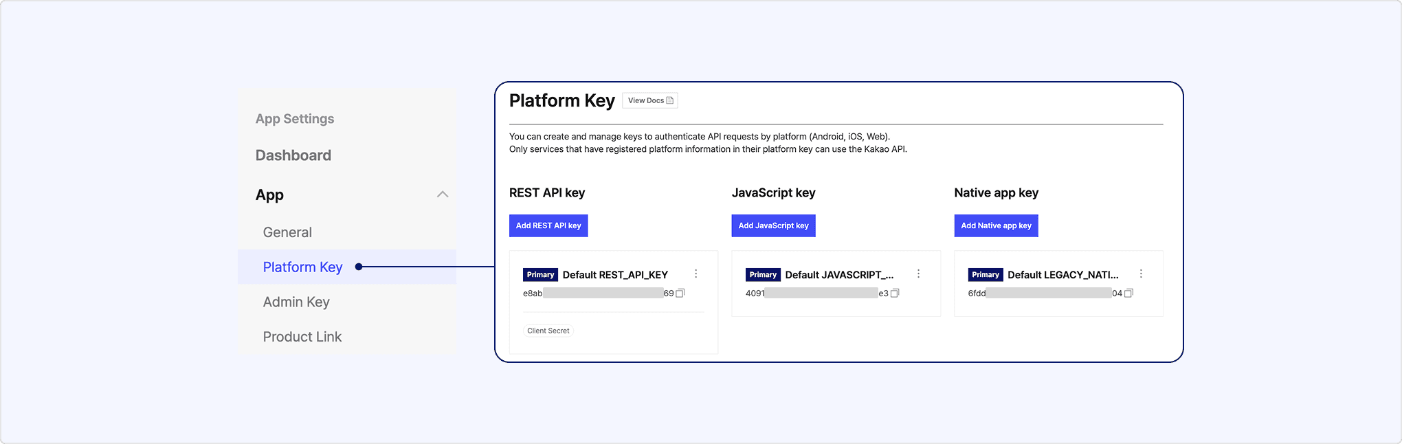 • REST API key, JavaScript key, Native app key: [App] > [Platform Key].