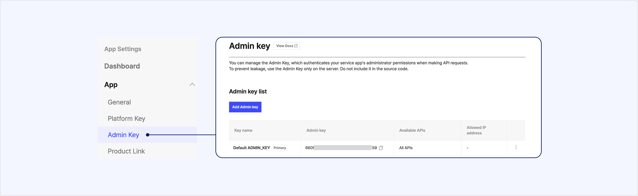 • Admin key: Allowed IP configuration, available APIs.