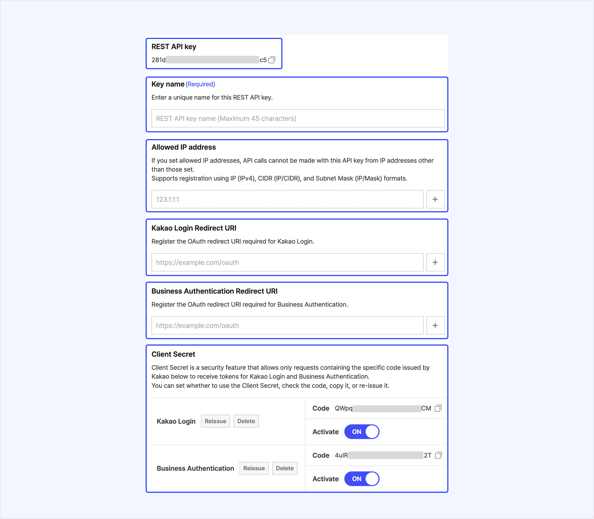 • REST API key: Redirect URI (Login/Business Authentication), client secret (Login/Business Authentication), allowed IP configuration.