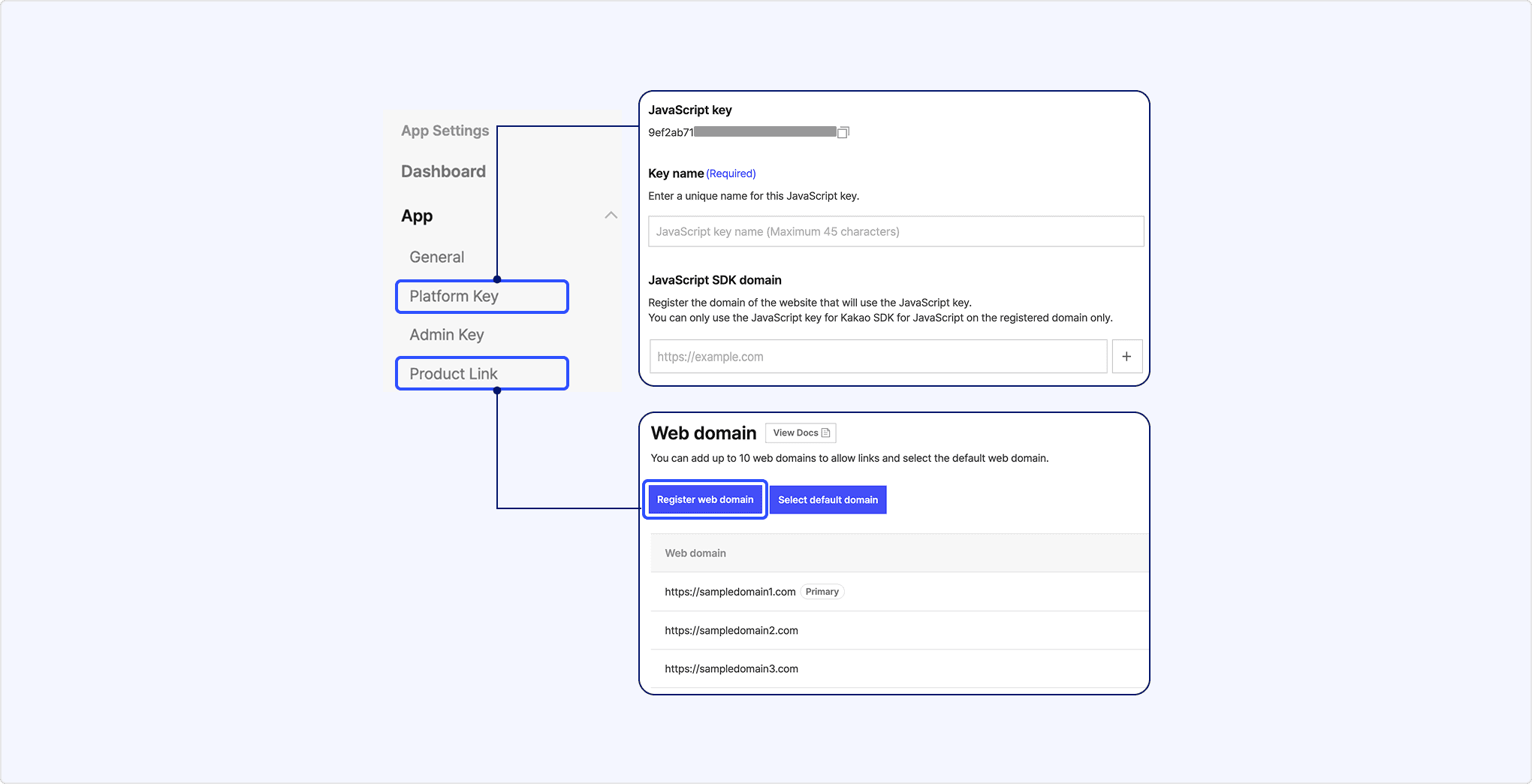 • JavaScript key: JavaScript SDK domain (previously 'Site domain'), Kakao Login redirect URI.