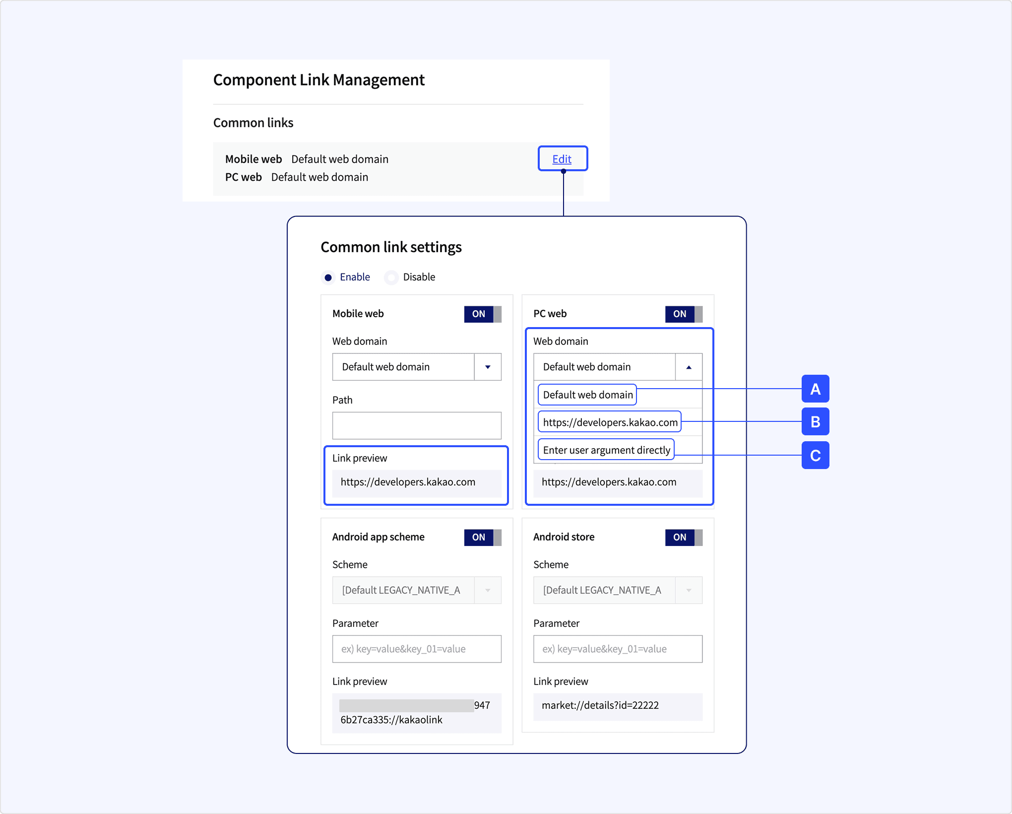 • [A] Default web domain: Default web domain configured in [App] > [Platform] > [Web domain]