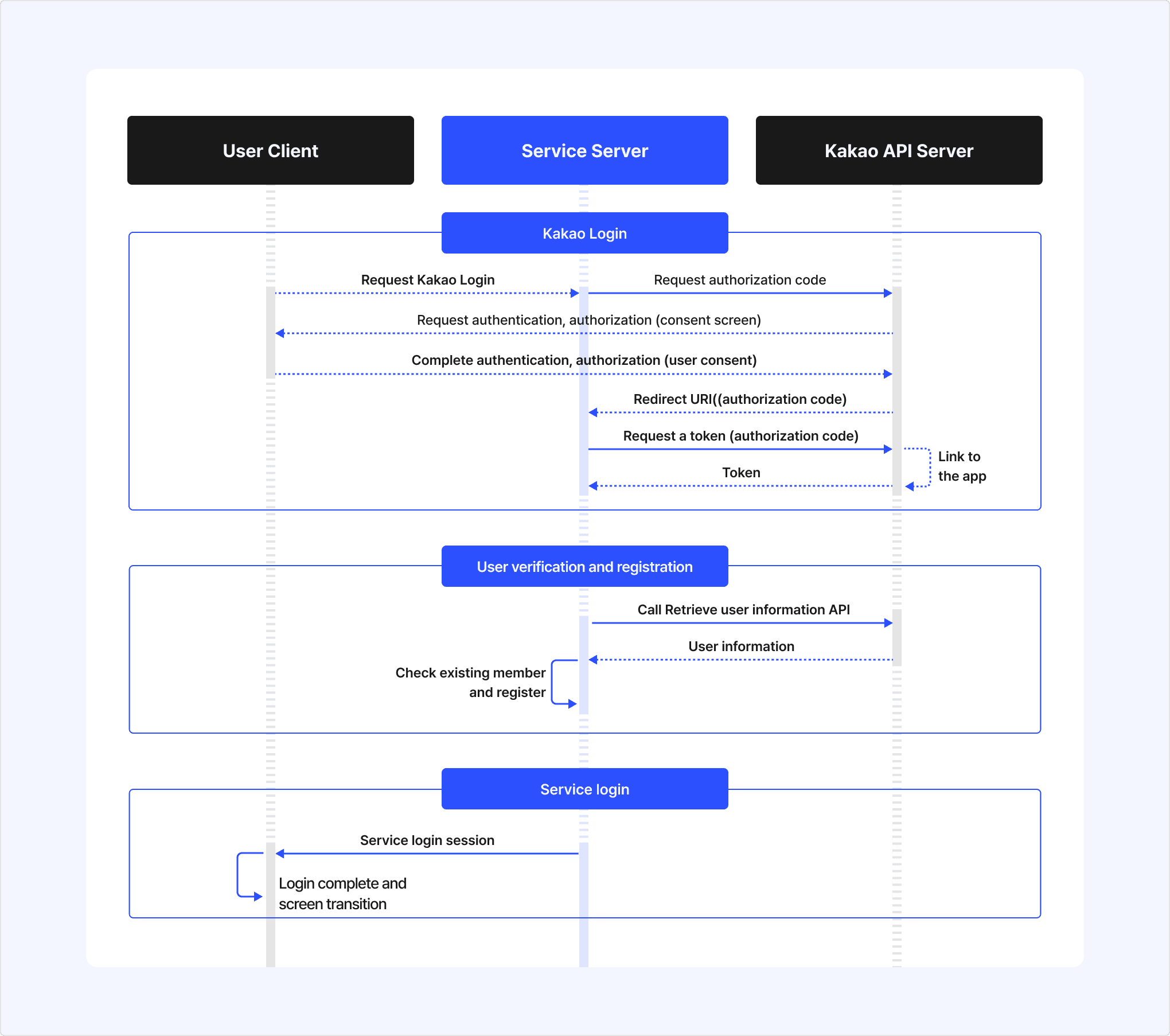 - When the service requests a token using the authorization code included in the redirect URI, the Kakao API server links the user with the service app and issues the user's token to the service.