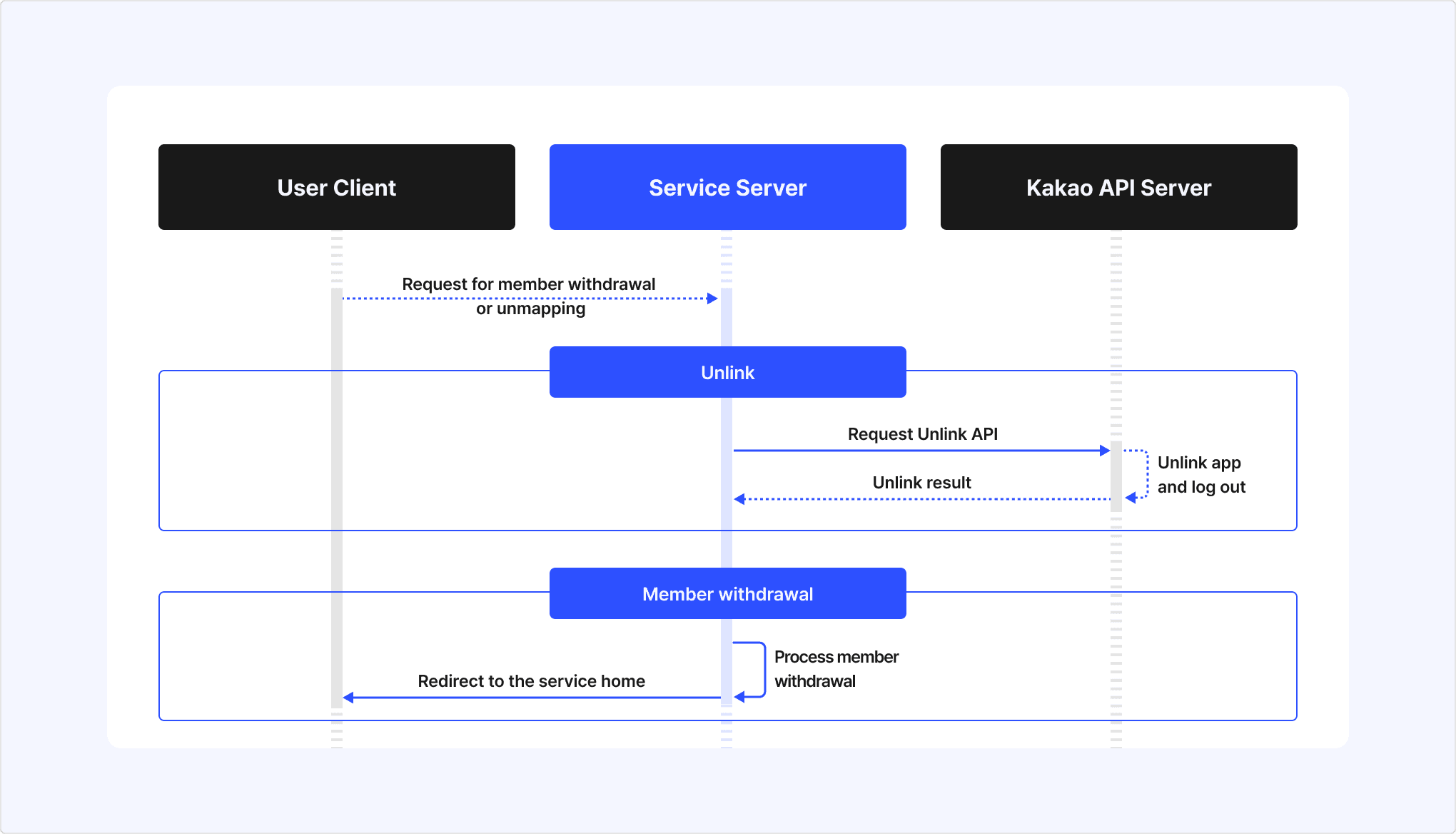 - When a Kakao Login user requests account deletion or unmapping, the service requests the unlink API for the user to the Kakao API sever.