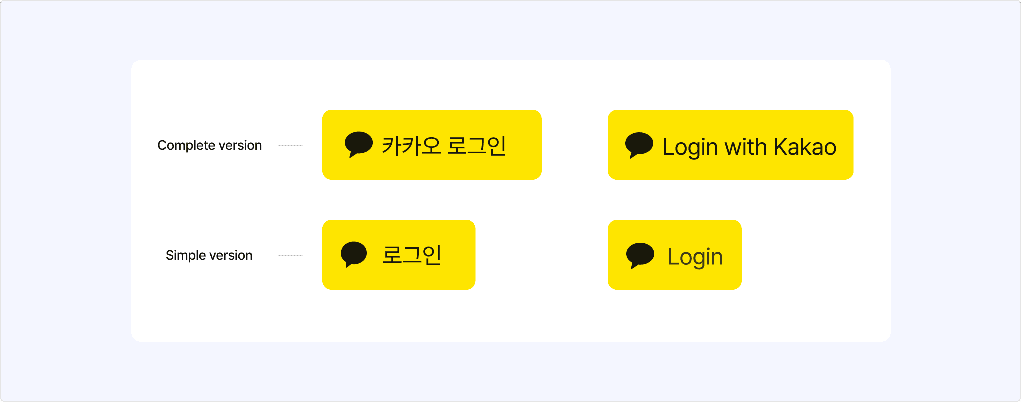 Kakao provides not only the standard buttons for you to apply them in your service more easily but also provides flexibility to customize the buttons according to the user interface or user experience in your service. However, you still must follow the design guidelines for the buttons so as not to damage Kakao's unique identity.