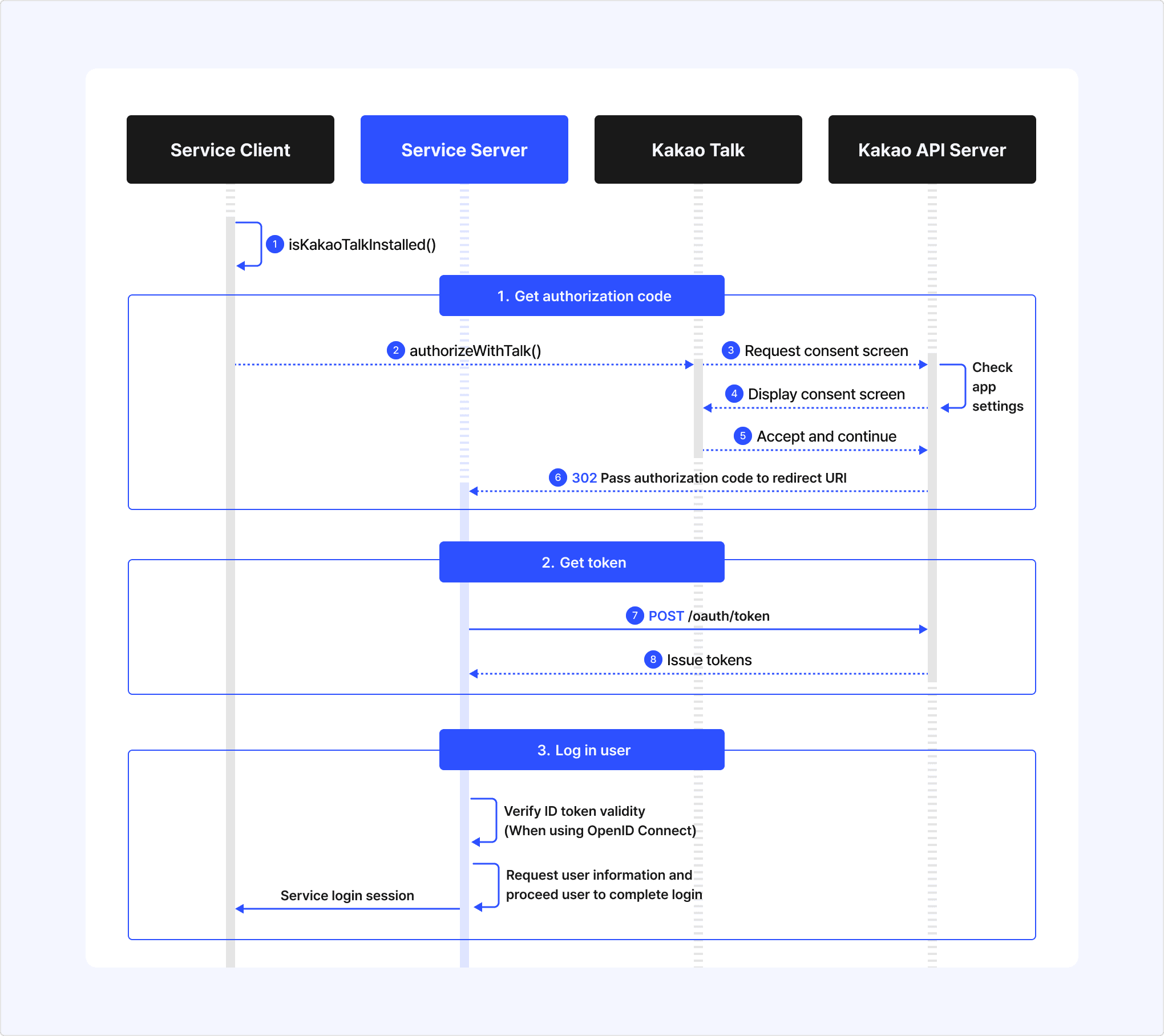 When using the Login with Kakao Talk: Web or Login with Kakao Account: Web for the redirect method, the service must request tokens from the service server to complete the Kakao Login process. The Kakao Login process using the redirect method is below.