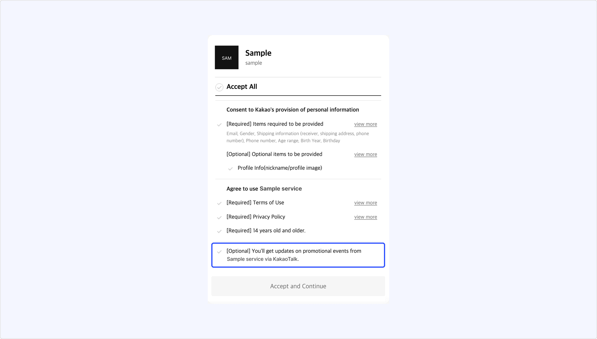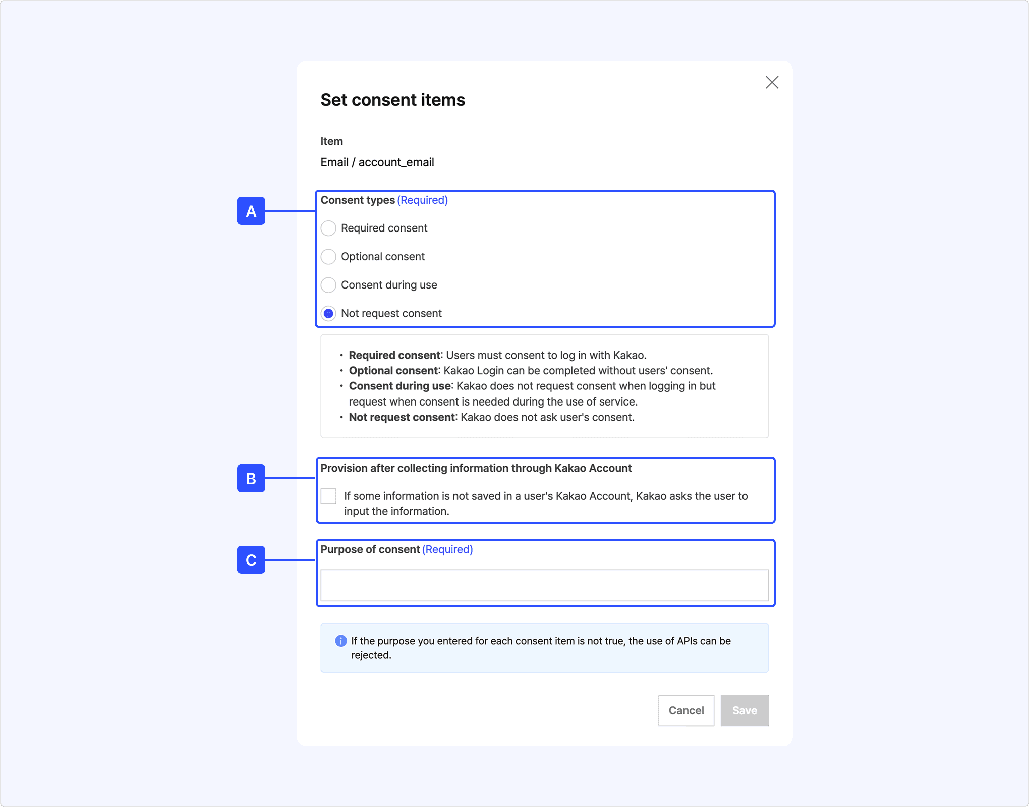 When you select the checkbox for [C] [Provision after collecting information through Kakao Account], information that is not registered in Kakao Account is also collected and provided after obtaining the user's consent. For details on this feature, see Provision after collecting information through Kakao Account.