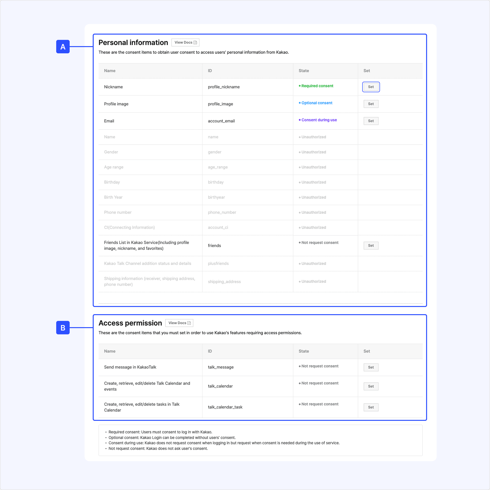 The following are the configurable lists of [A] Personal information consent items and [B] Access permission consent items. Refer to the full lists of each consent item below to check which items require user consent in your service.