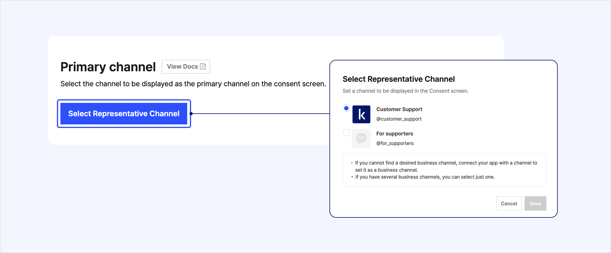 - On the app management page, select [Select primary channel] in [Kakao Login] > [Consent items] > [Primary channel] to choose one of the connected Kakao Talk Channels as the primary channel.