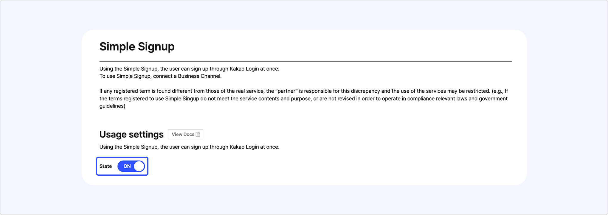 - Set [Usage settings] to [ON]. At least one terms must be enabled to enable the Simple Signup.