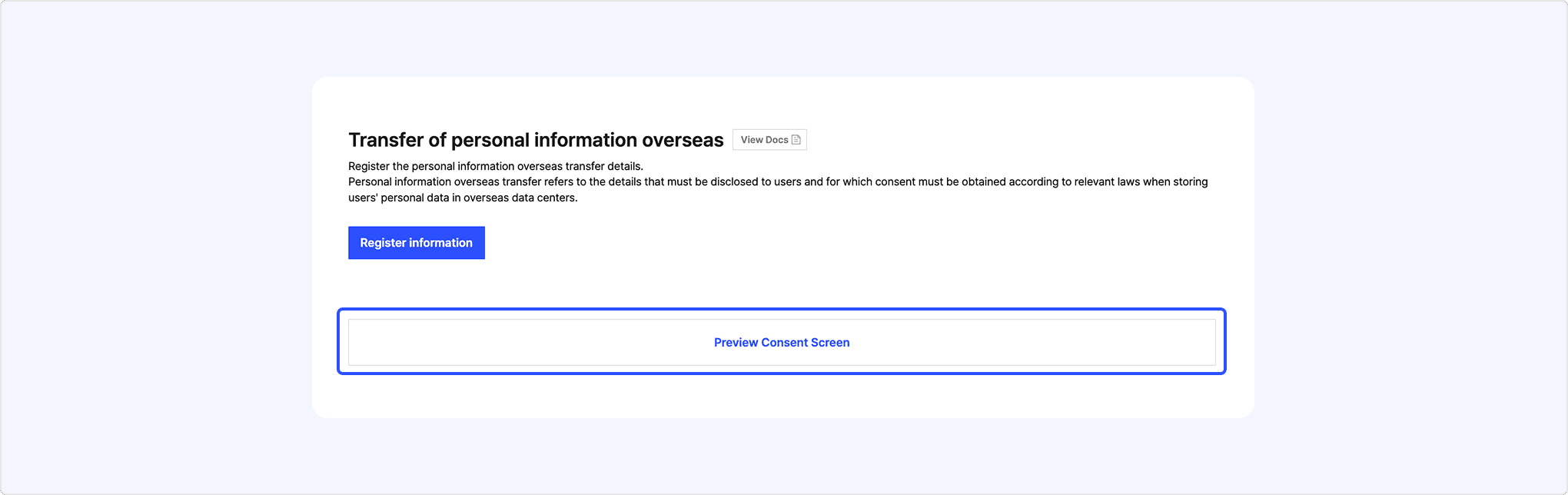 You can register Transfer of personal information overseas information in [Kakao Login] > [Consent Items] > [Transfer of personal information overseas] on the app management page.