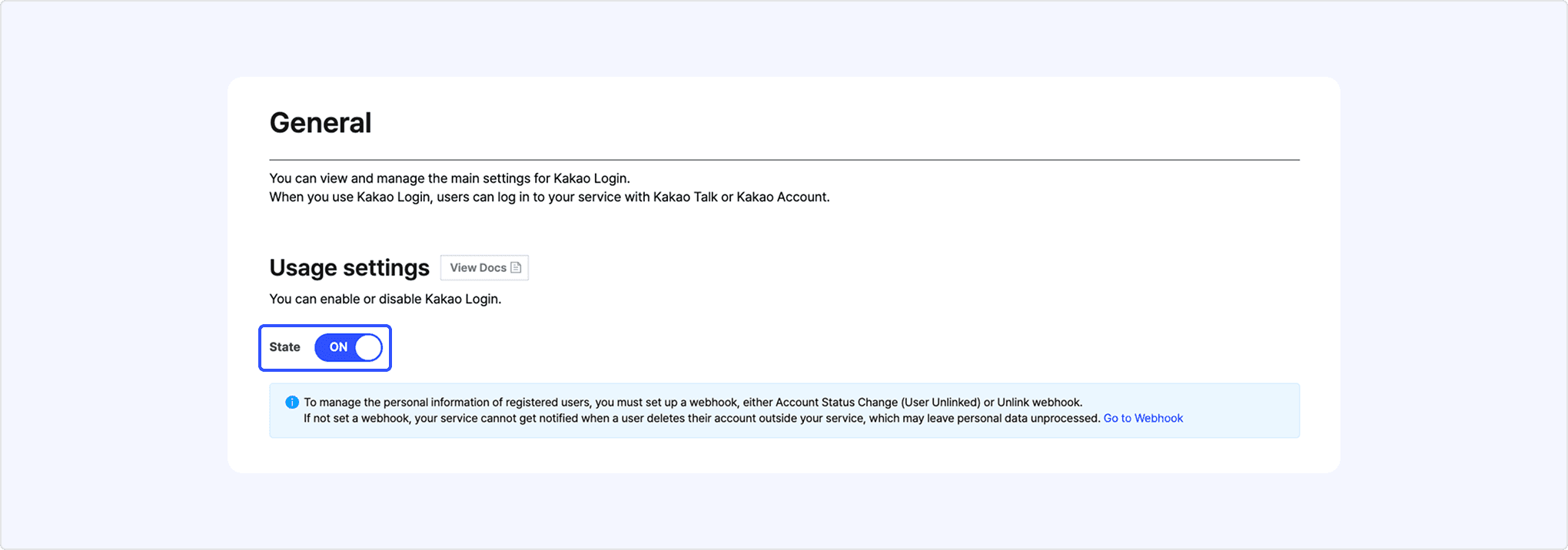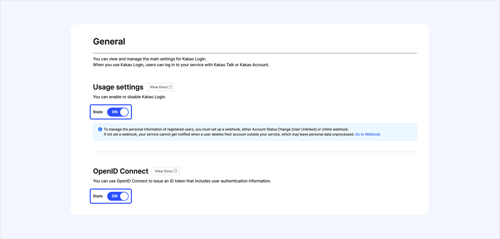 - Set [State] to [ON] in [Usage settings] to activate Kakao Login. You can use OpenID Connect only when Kakao Login is enabled.