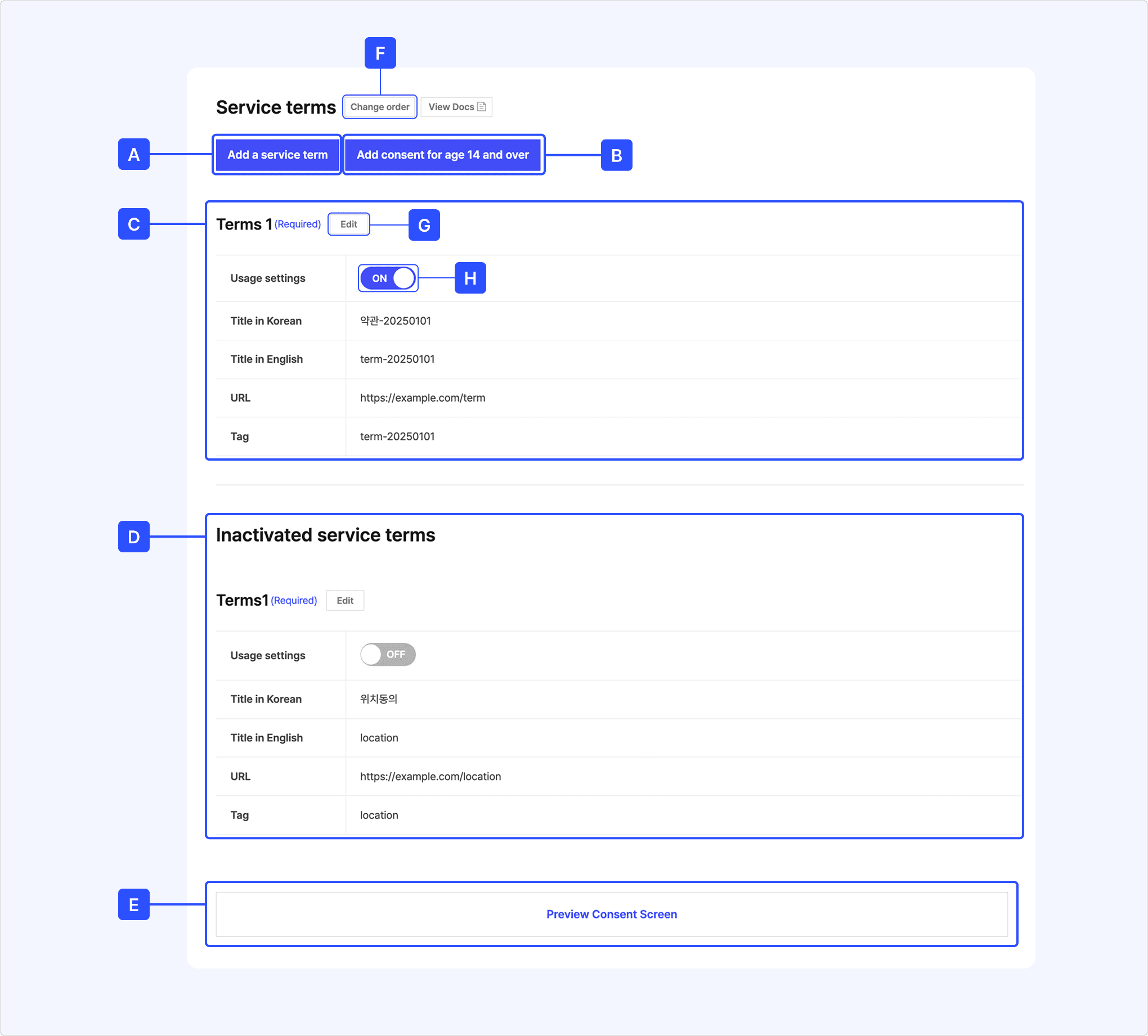 - Korean service terms titles support only Korean, English, numbers, spaces, and special characters that can be entered directly from the keyboard (up to 45 characters).