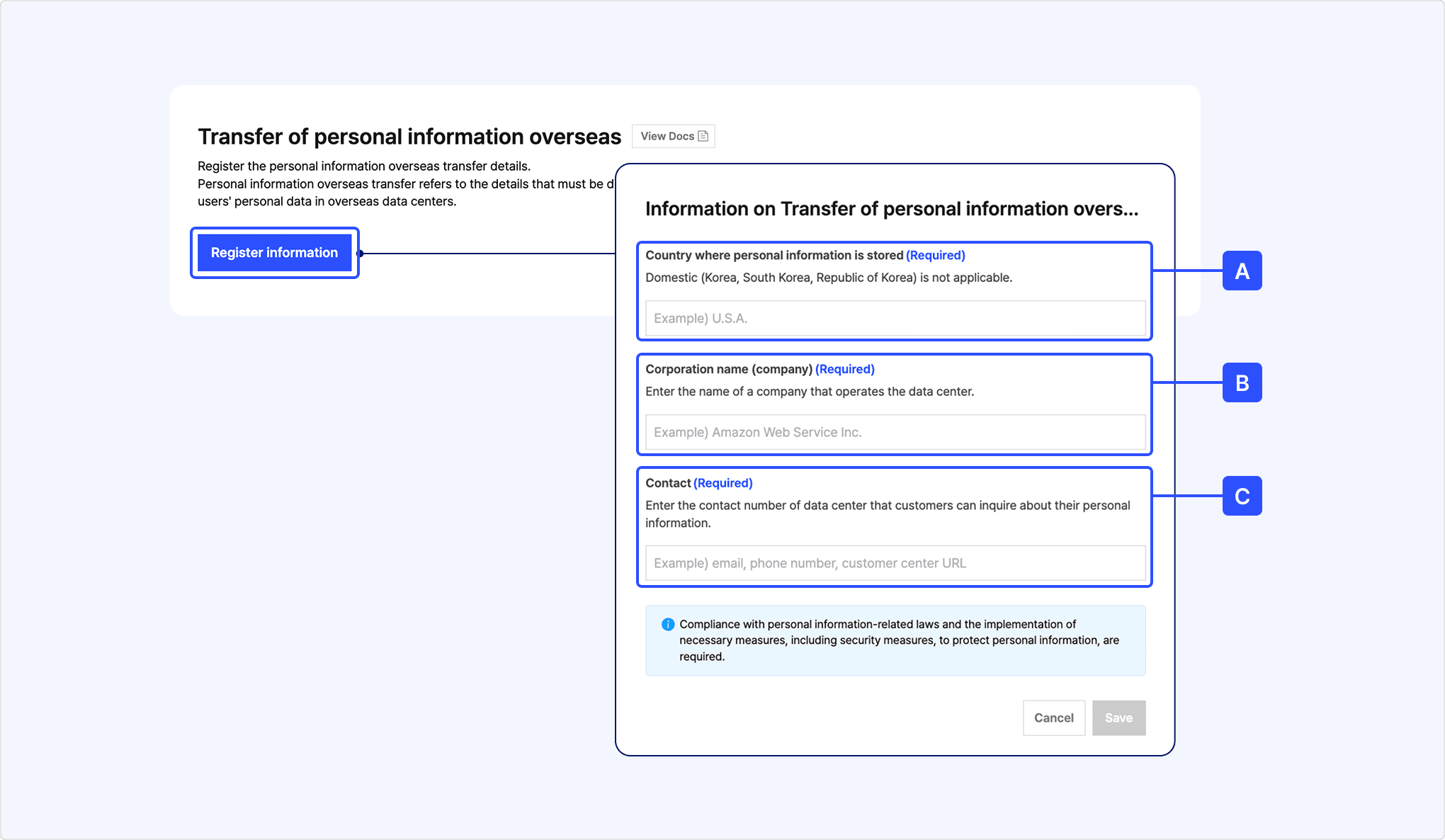 [A] Country where personal information is stored: Enter the name of the country where personal information will be transferred.