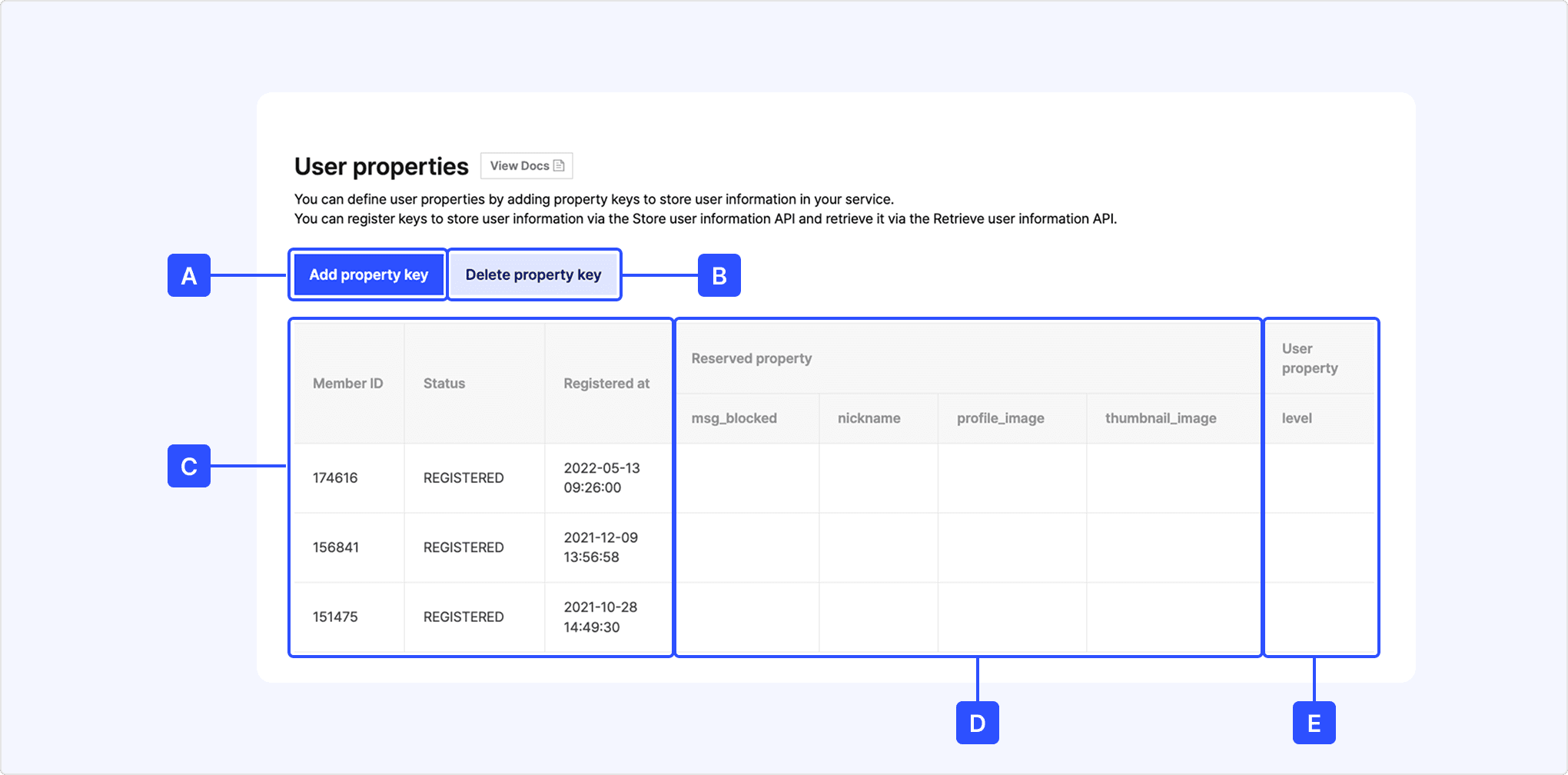 You can register user property keys and check the stored values for members linked to the app in [Kakao Login] > [Advanced] > [User property] on the app management page. Up to 5 user property keys (excluding user property reserved keys) can be registered per service.