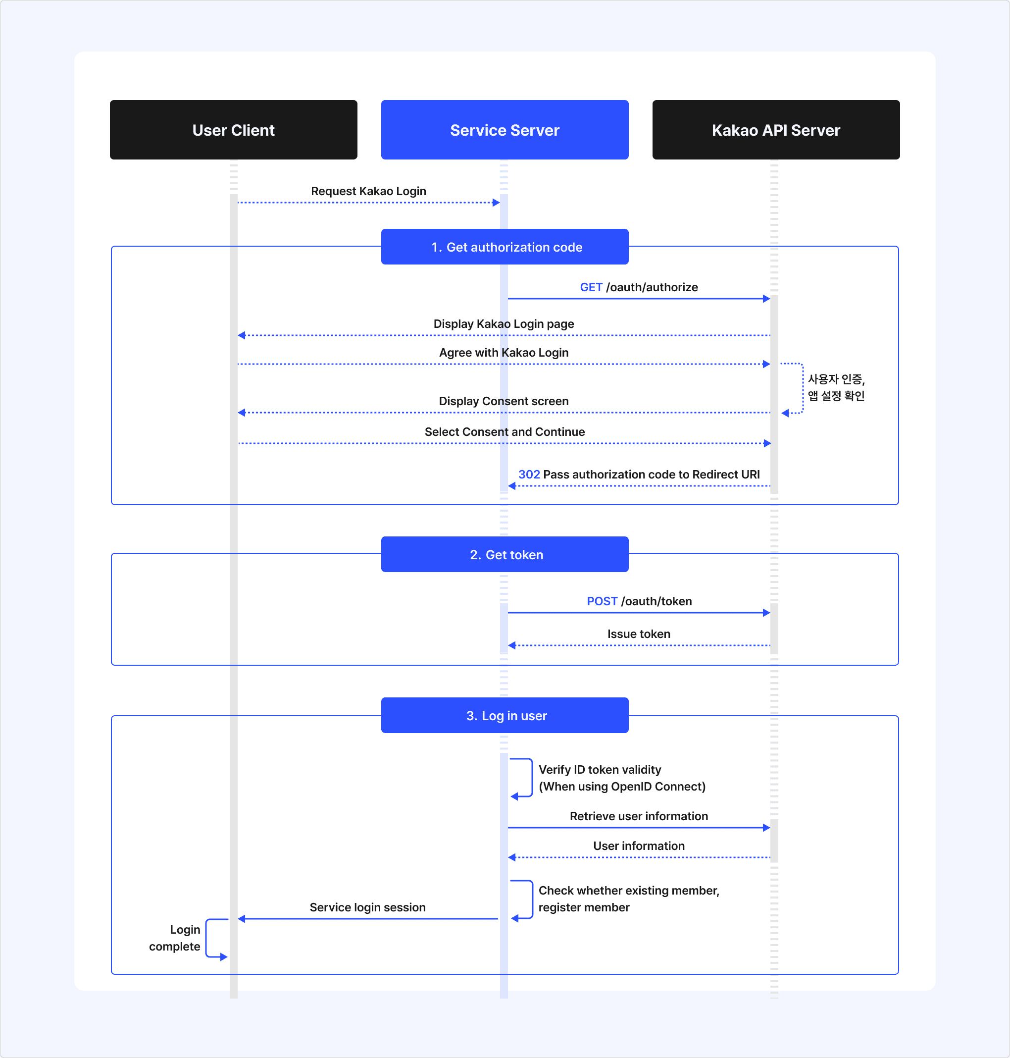 - The Kakao authentication server issues a token and delivers it to the service server.
