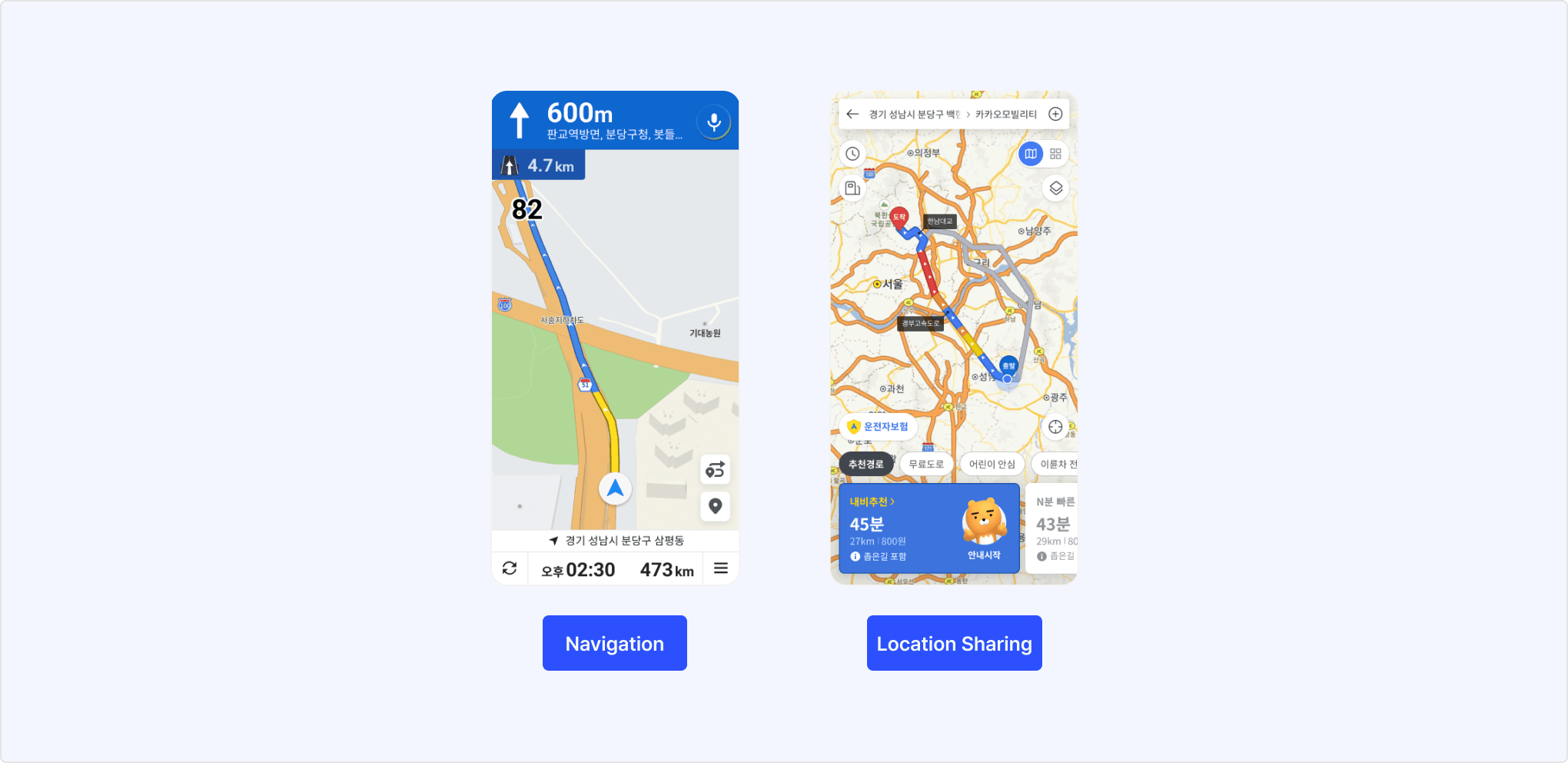 | Navigation | Launches Kakao Navi and gets directions to the specified destination. Available to set navigation options such as vehicle type and specify up to three waypoints. |