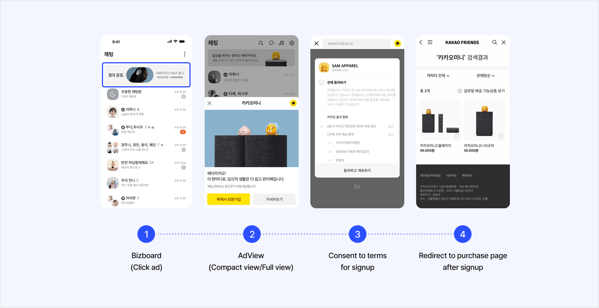 In Kakao Talk Bizboard, an AdView is used to promote pages. Thus, you should implement a page to move to the Kakao Sync Consent screen when a user clicks the AdView. You may need an extra job for the landing page depending on the development method between REST API and JavaScript. See Develop for more details.