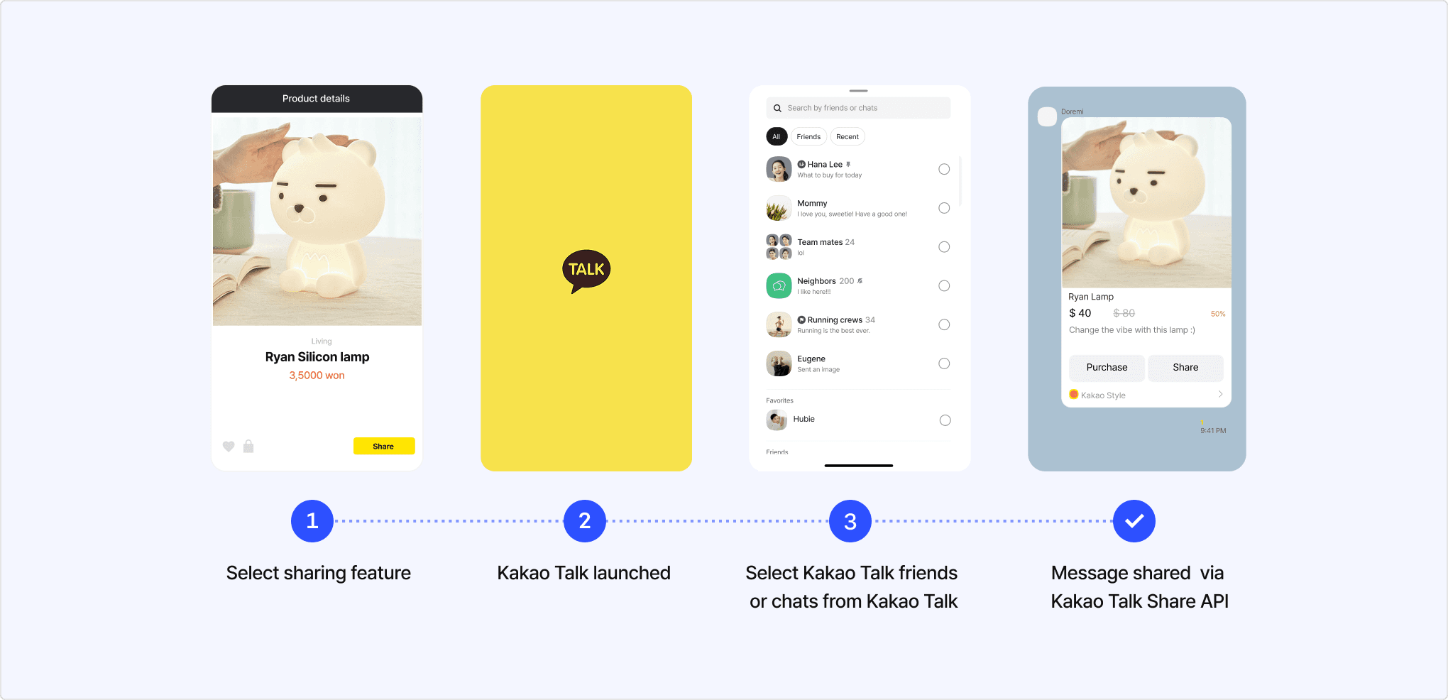 Kakao Talk Share is a feature that allows users to manually select content from a service and share it to a Kakao Talk chatroom. The content sharing feature using Kakao Talk Share can be utilized as a means for event promotion or user acquisition.