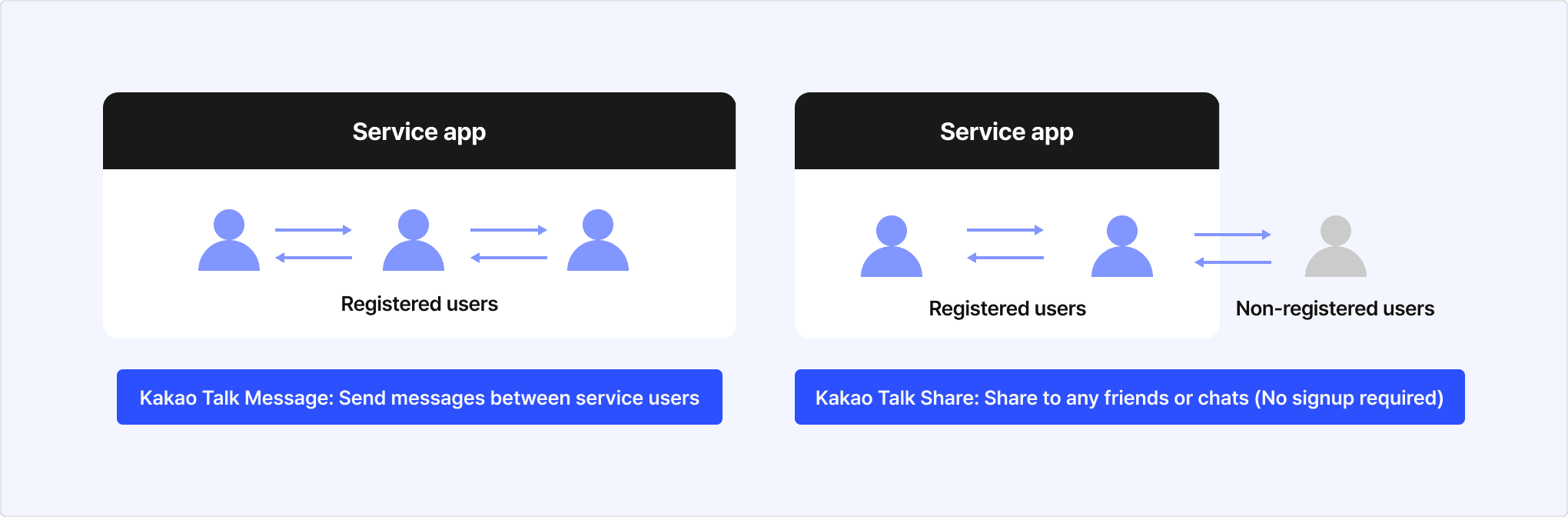 This section explains the differences between Kakao Talk Share and Kakao Talk Message, both of which are Kakao Talk Message sending features provided by Kakao Developers. Both features only support user-to-user messaging, and services cannot send messages directly to users.