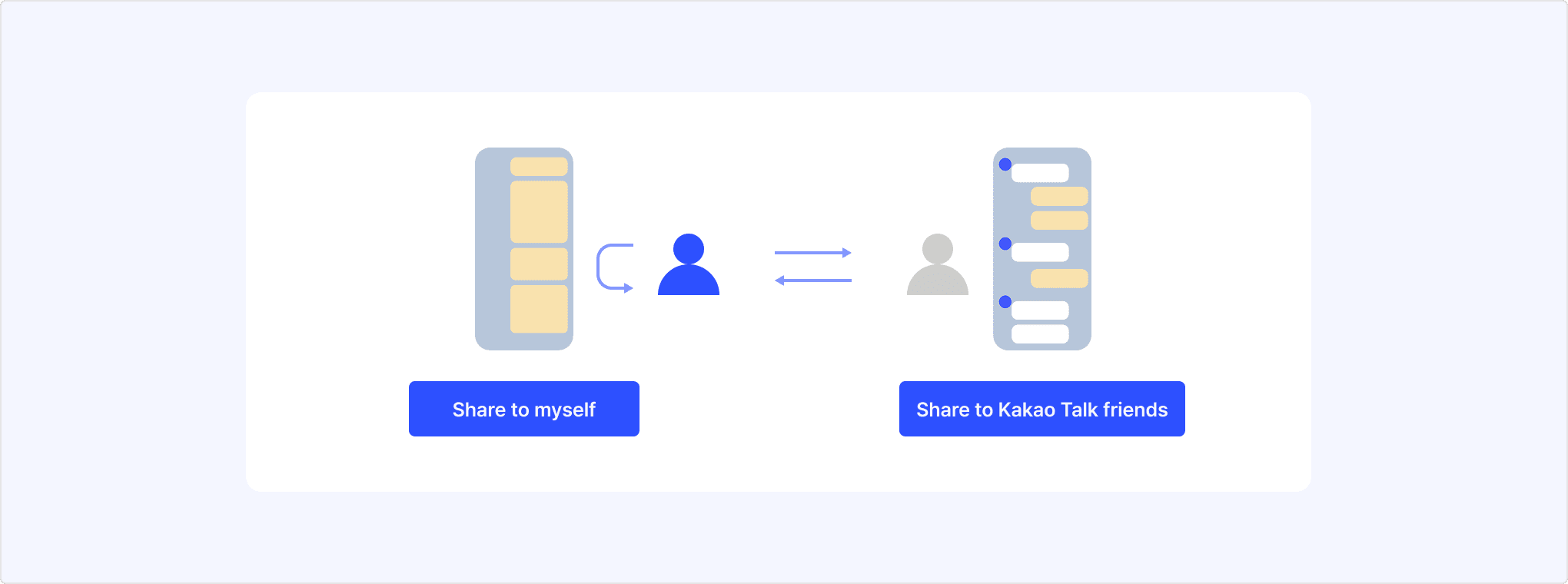 | Kakao Talk Share | Users select content in the service and share it to Kakao Talk chatrooms themselves. Recommended use: Implementing content sharing features between users. | Kakao Talk user → User's Kakao Talk friends | Kakao Developers |