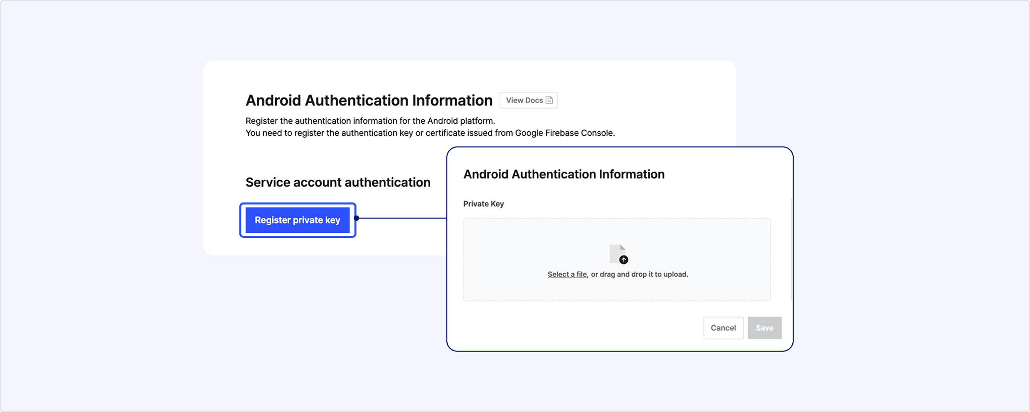 For the Android platform, register the Private Key file of service account you obtained from the Google Firebase Console.