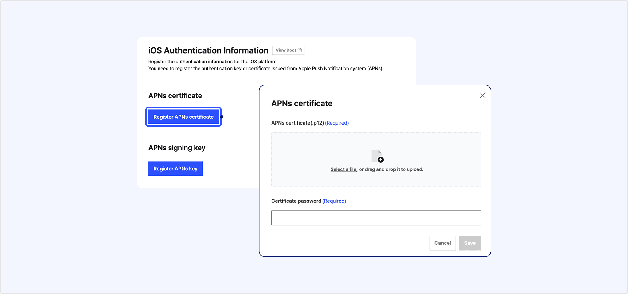 For the iOS platform, register either the authentication key (Apple Push Notification Authentication Key, hereafter APNs authentication key) or certificate issued through the Apple Push Notification system (APNs) in the app information as described below.