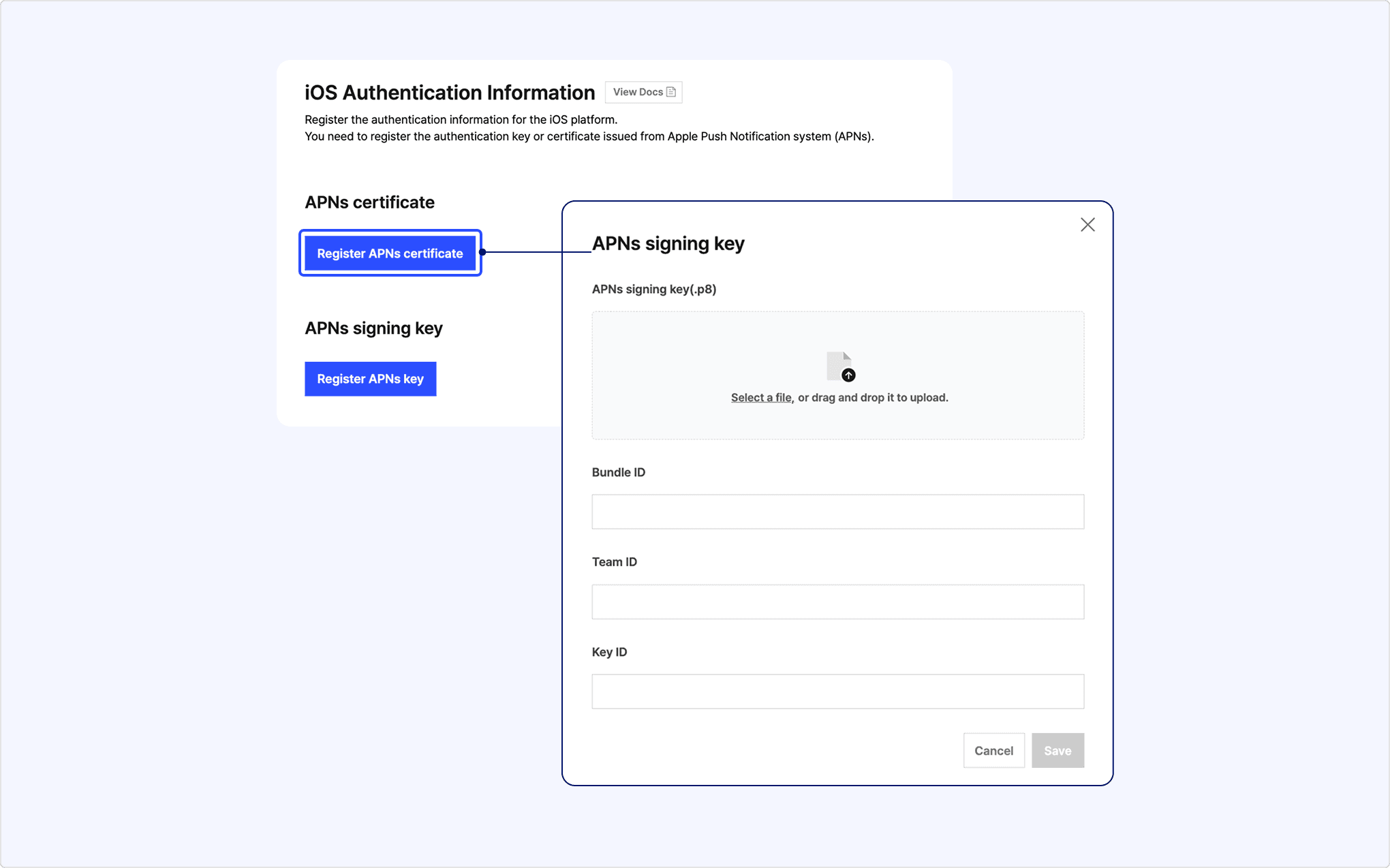 - APNs signing key: Upload the APNs authentication key downloaded from the Apple Developer website. (See step 4 above.)