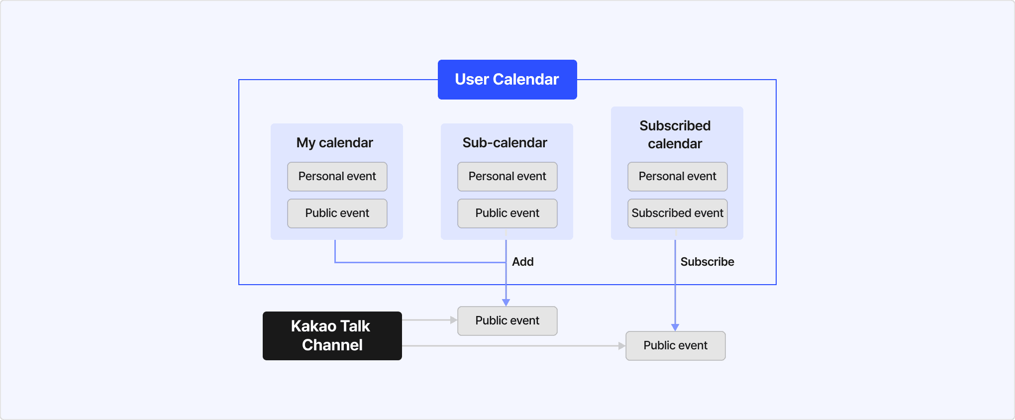 | Subscribed Calendar ([C]) | Calendar that Kakao Talk Channel publishes or manages to let users subscribe to the calendar based on interests. | A service can request to create a subscribed calendar at DevTalk. |