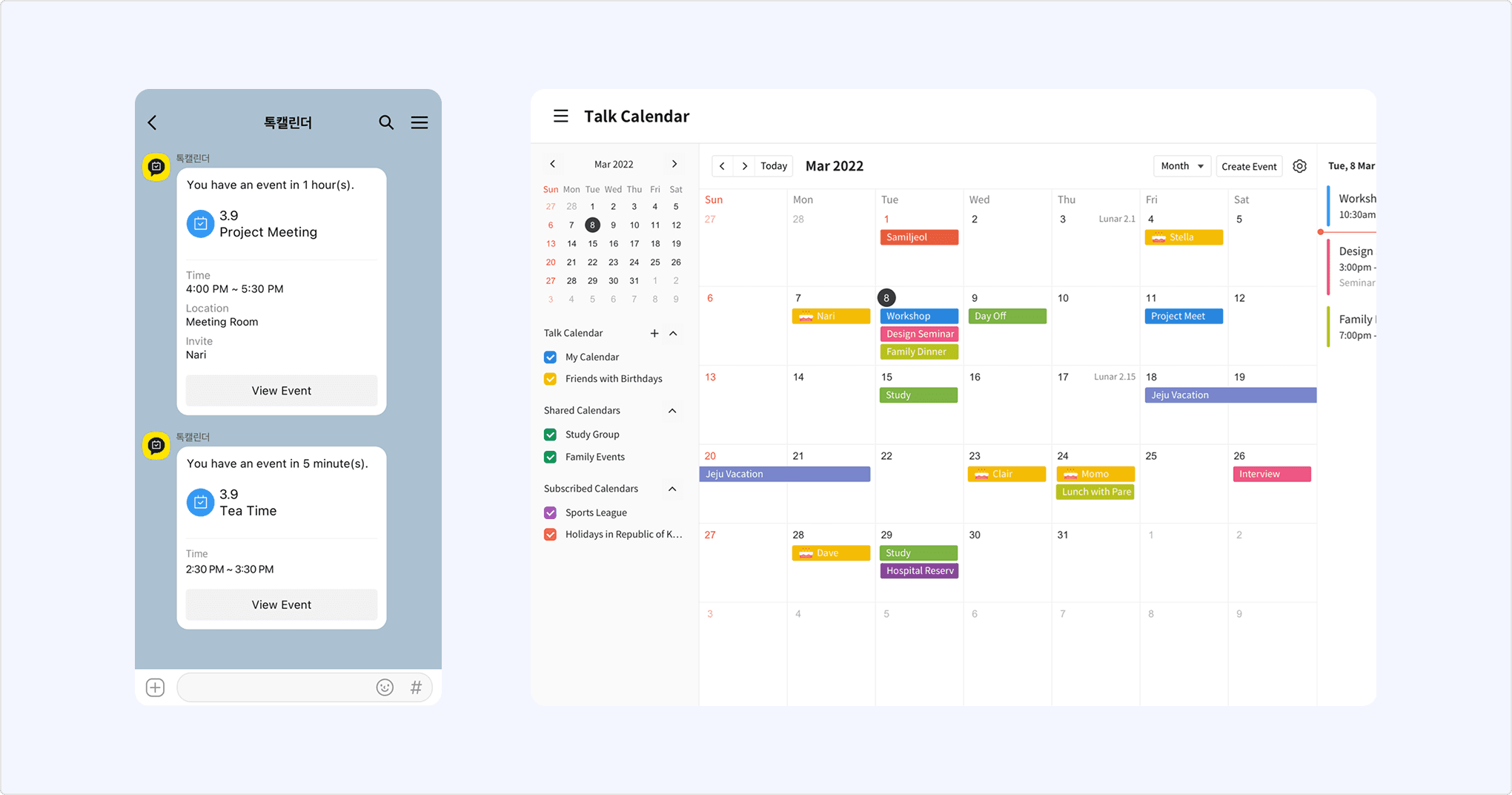 Talk Calendar is a service that allows you to quickly create schedules in Kakao Talk chat rooms and easily manage daily tasks by registering to-dos. By using the Talk Calendar API, your service can provide features to add and manage users’ calendars, schedules, and to-dos. Kakao Talk Channel managers can share schedules that include the Marketing area to further increase advertising effectiveness.