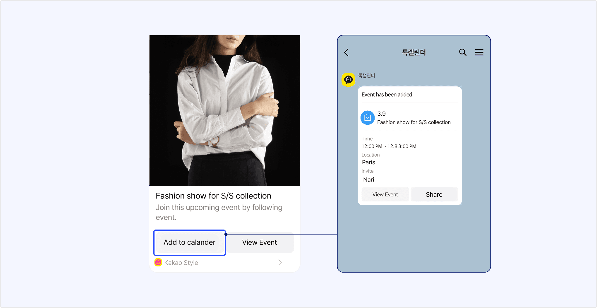 If your service uses a public event or subscribed calendar, you can encourage users to add the event or calendar to their calendar by sending a Kakao Talk message through the Kakao Talk Share API or the Kakao Talk Message API. For this, you need to configure a message with a follow or subscribe button by using the calendar template.