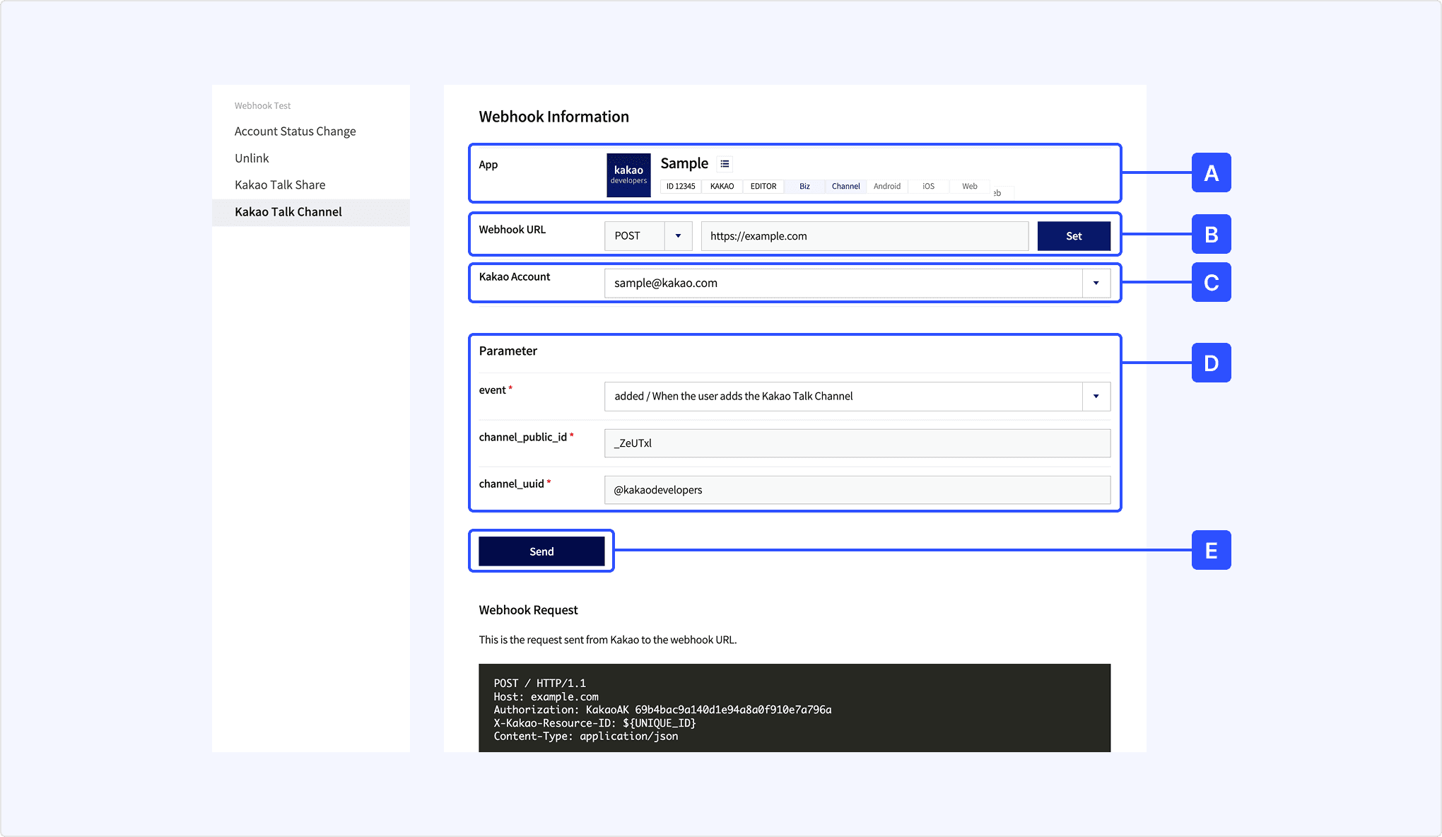 - [D] Parameter: Set the event properties. When testing, the Kakao Developers channel ID is used.