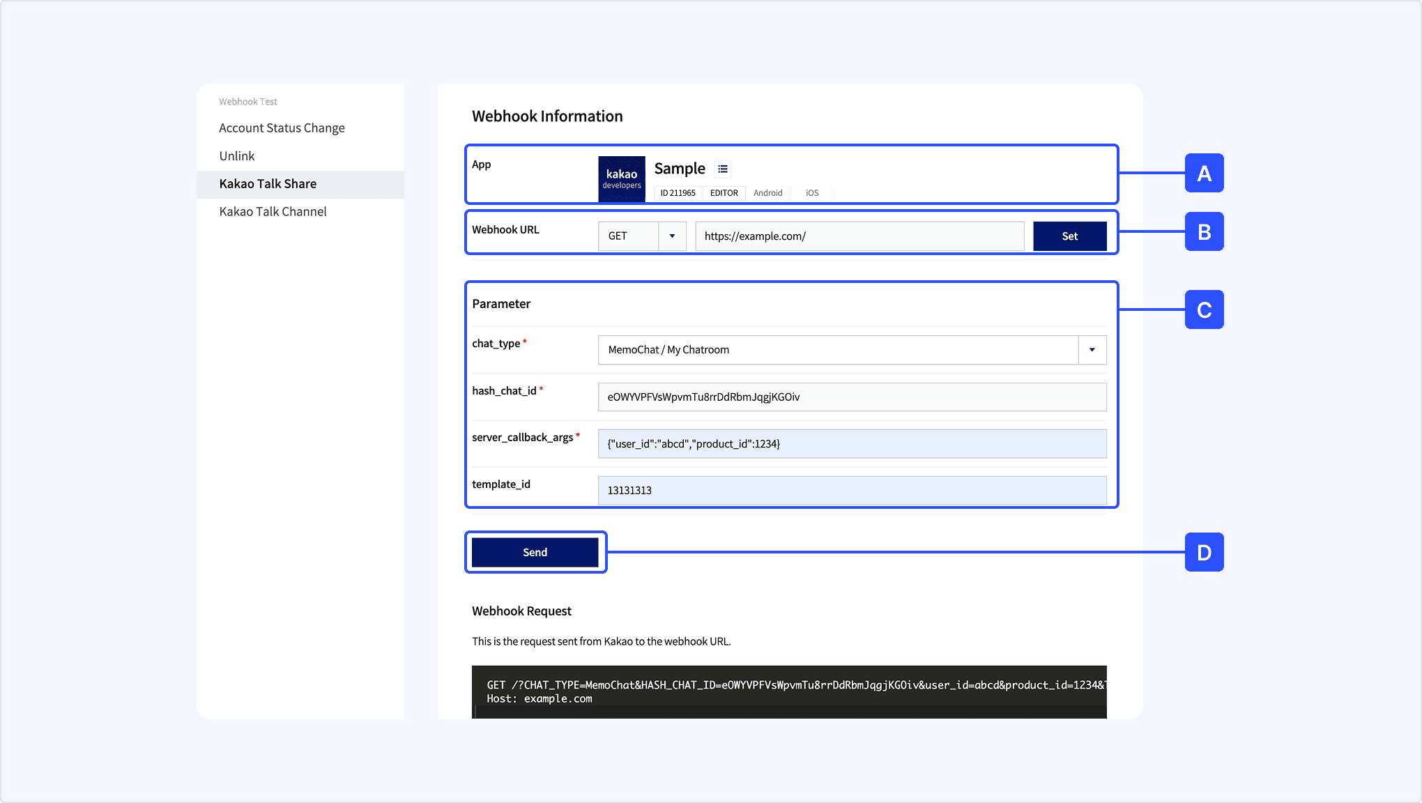 - [B] Webhook URL: Check the webhook URL to receive the webhook. If no webhook URL is specified, click [Set] and set the Kakao Talk Share webhook.