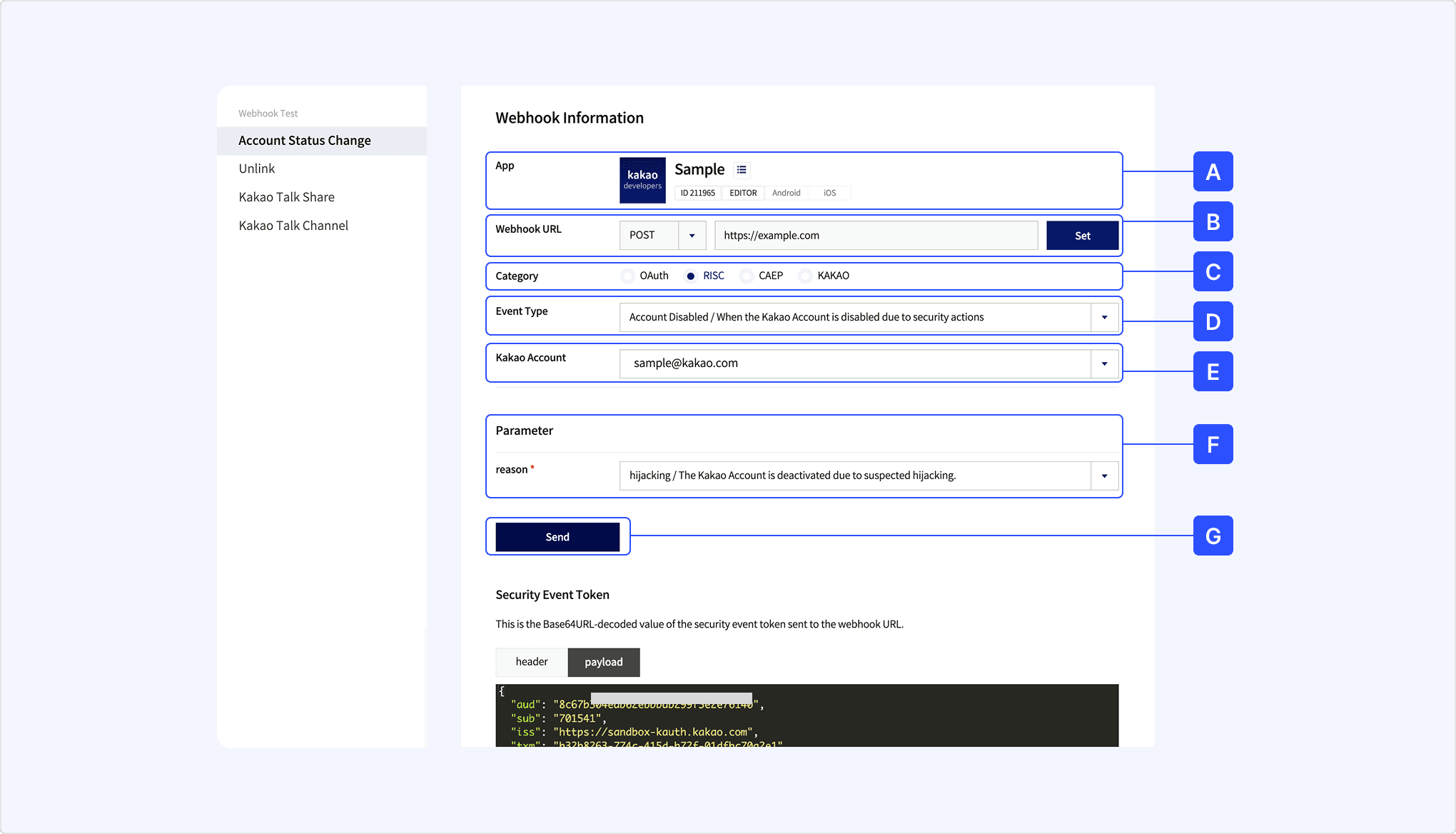 - [E] Kakao Account: Select the team member to send the event to. The selected account must be linked to the app.