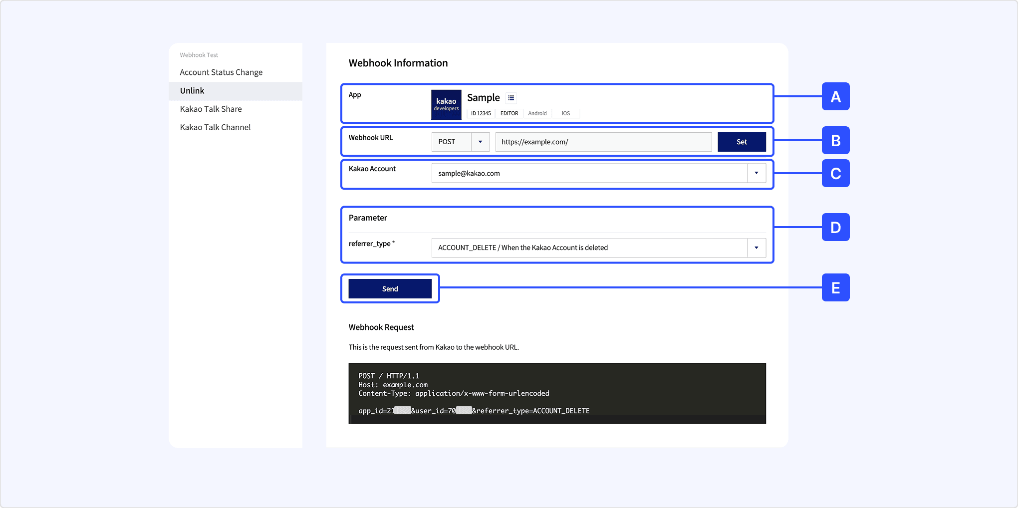 - [E] Send: Click to send the webhook. If the webhook URL is not registered, click [Request Preview] to check the sample request. (Note: Webhook request example.)