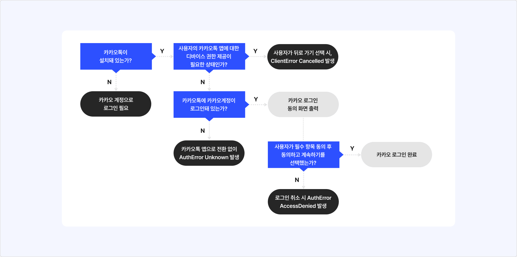 Android의 경우, 사용자 디바이스의 카카오톡 상태에 따라 카카오톡으로 로그인 시 에러가 발생할 수 있습니다. 아래 이미지의 주요 에러 발생 케이스를 참고합니다.