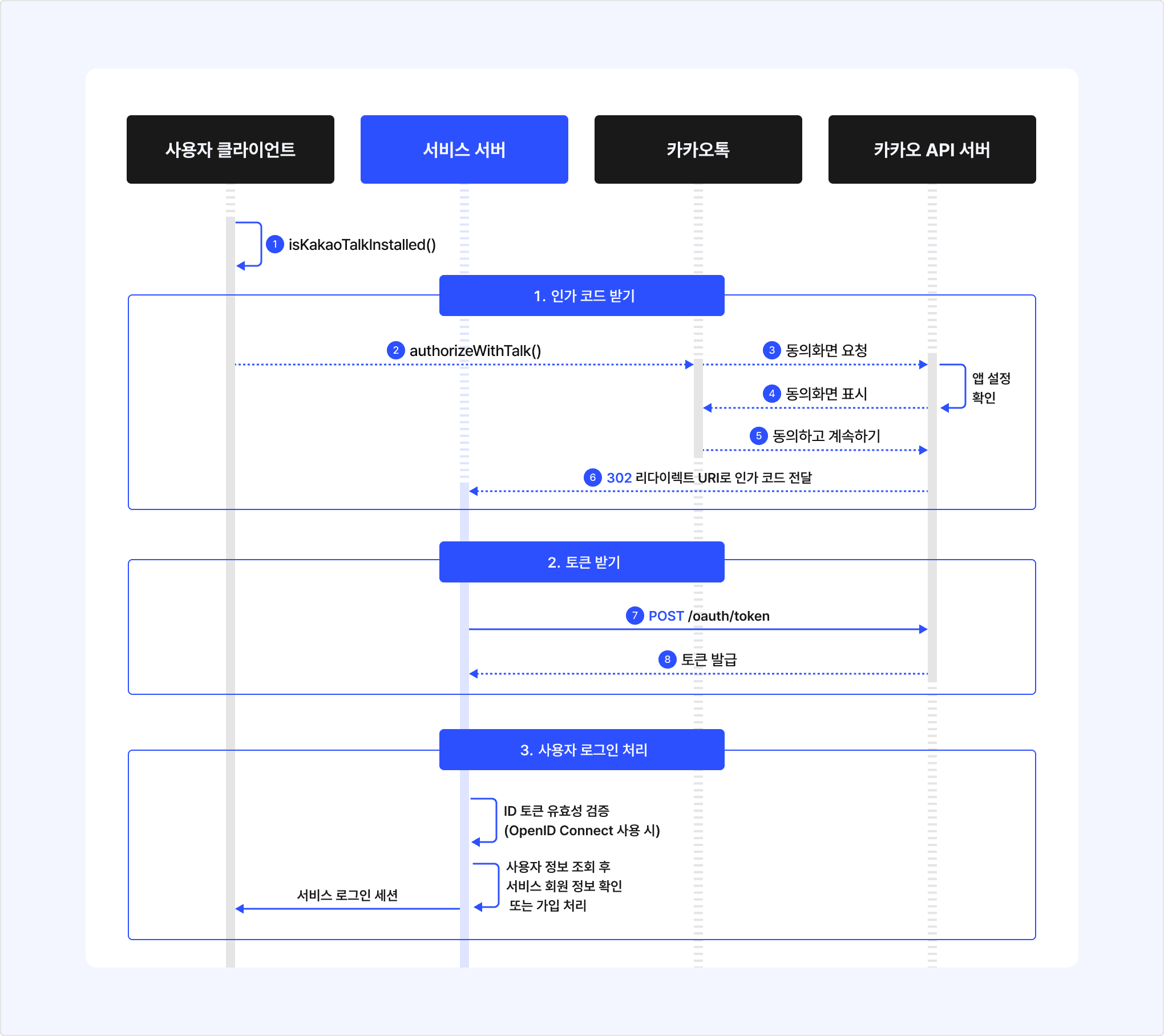 - 이 외 서비스에서 필요한 로그인 절차를 수행한 후, 카카오 로그인한 사용자의 서비스 로그인 처리를 완료합니다.
