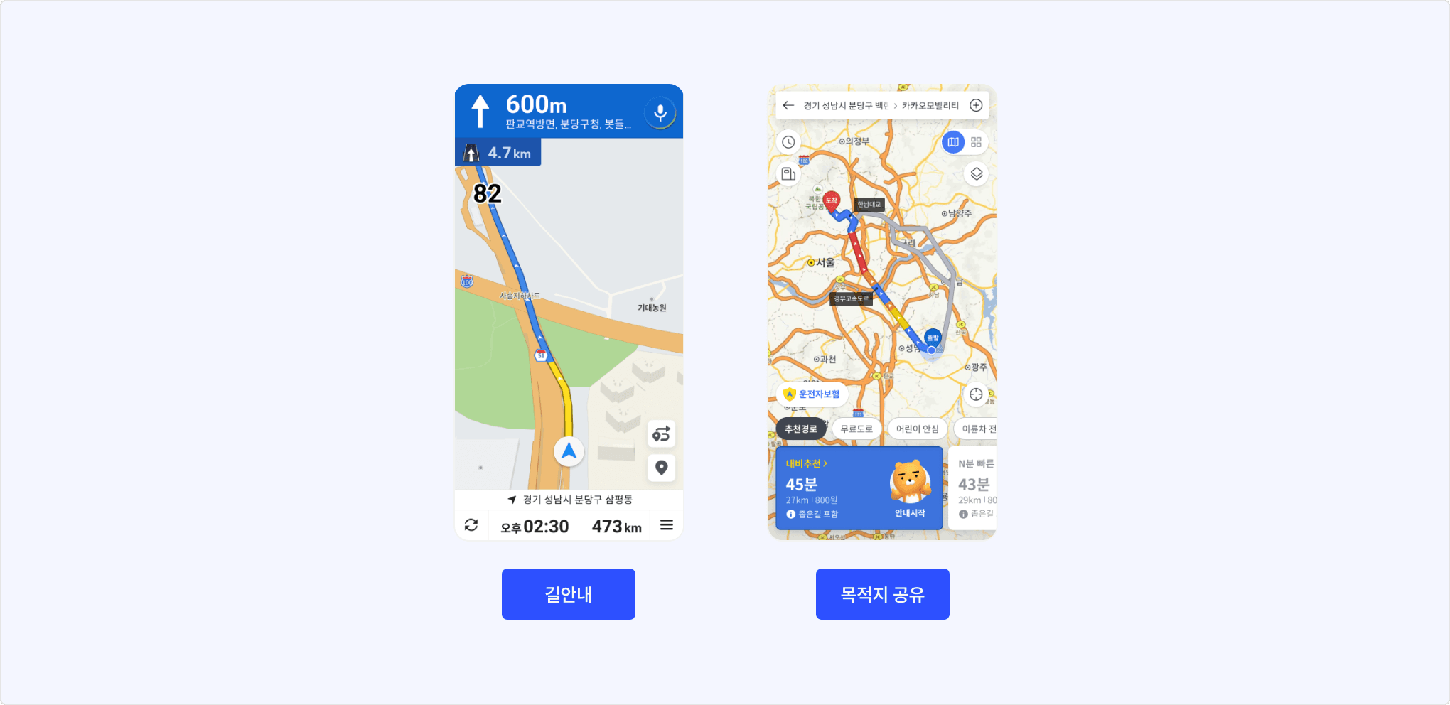 카카오내비를 실행하지 않고 내 서비스 안에서 바로 길 안내 기능을 사용할 수 있는 내장형 SDK입니다. 카카오내비에 지도와 경로를 요청하여 내 서비스에 꼭 맞는 기능들을 선택해 사용할 수 있습니다. 사용자의 목적에 따라 사용자 맞춤 설정이 가능한 길찾기 SDK와 기본 UI를 제공하는 길찾기 SDK with UI 중 선택할 수 있습니다.
