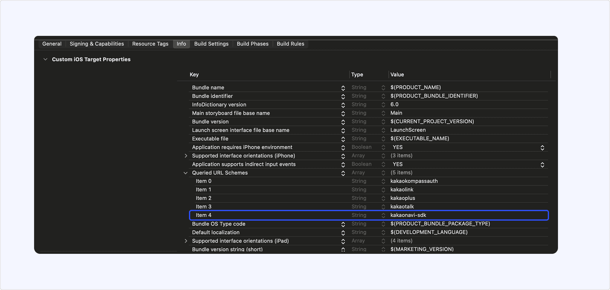 카카오내비 앱 실행을 위해 Info.plist 파일에 URI Scheme 설정을 추가합니다. 아래와 같이 LSApplicationQueriesSchemes에 'kakaonavi-sdk' 값을 추가합니다.