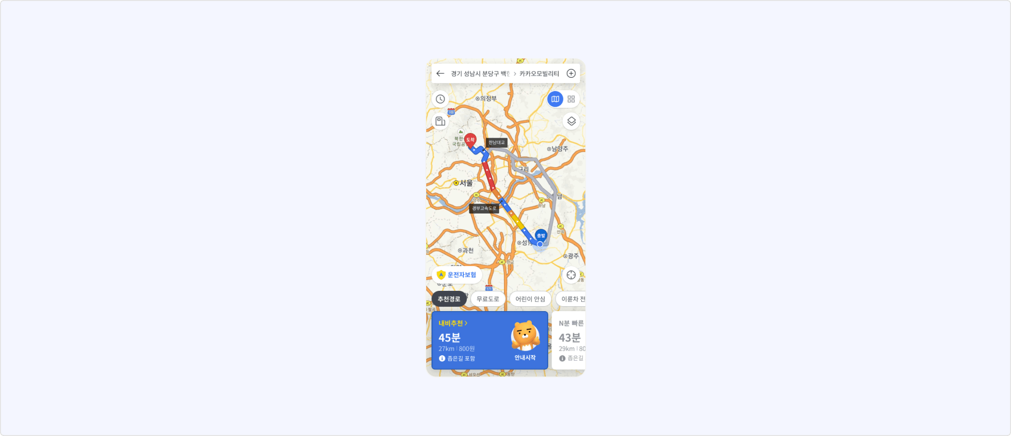 카카오내비를 실행하여 목적지까지의 길을 안내합니다.