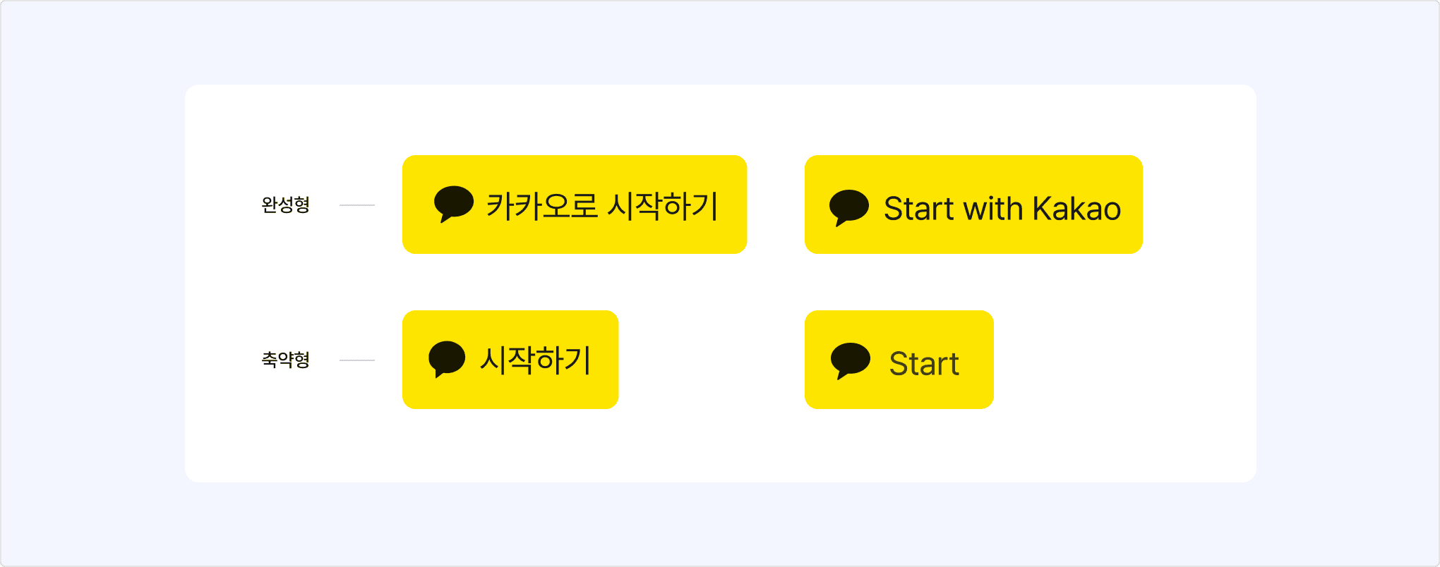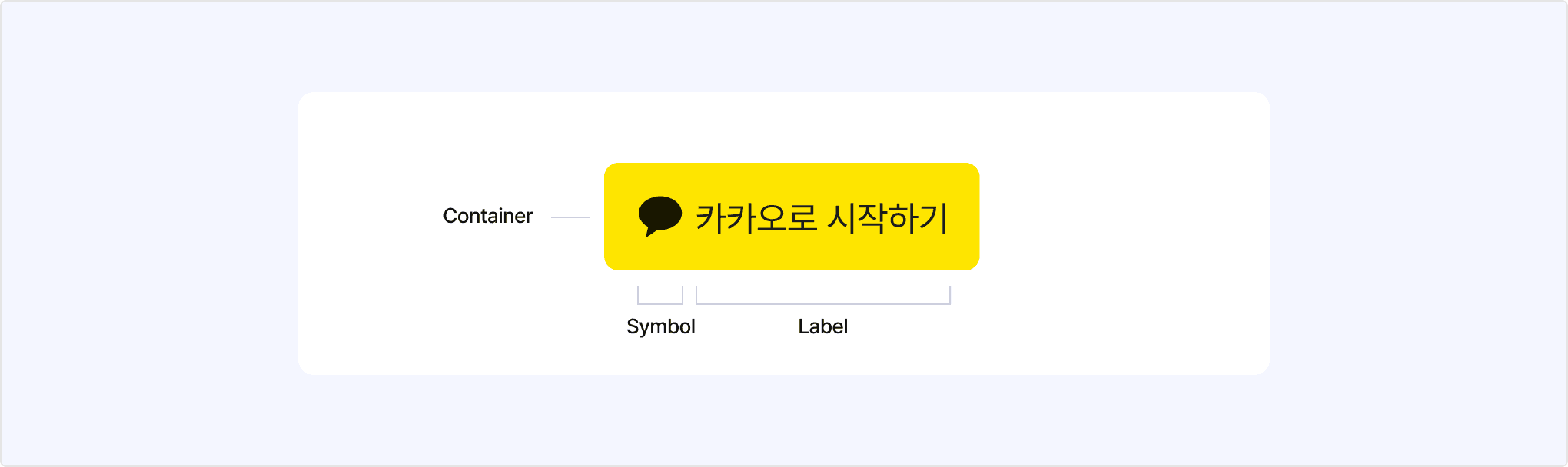 카카오로 시작하기 버튼은 카카오를 상징하는 말풍선 모양의 심볼(Symbol), 버튼의 용도를 안내하는 레이블(Label), 그리고 심볼과 레이블을 감싸는 컨테이너(Container)로 이루어져 있습니다.