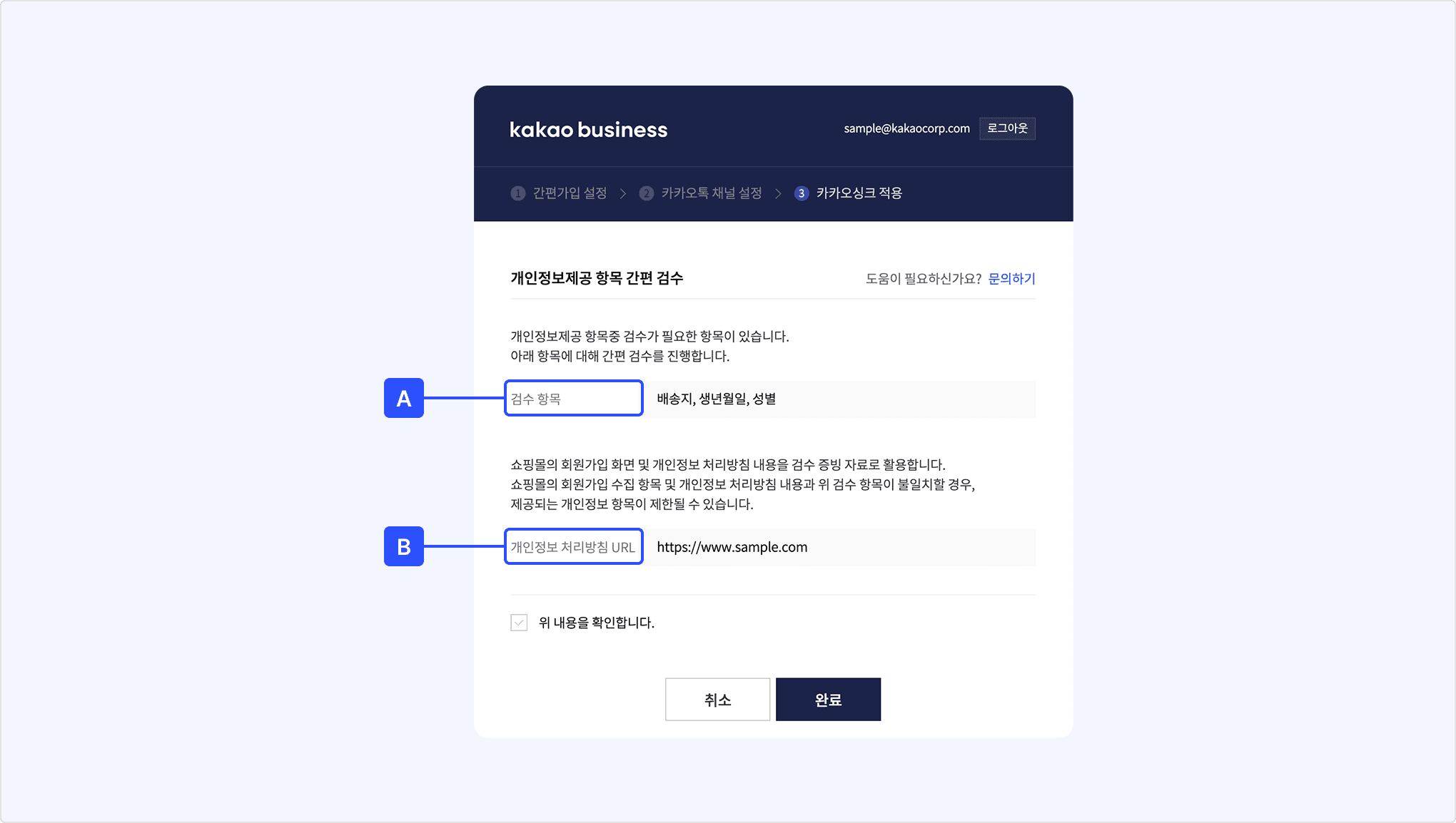 [D] 설정 내용 확인 시 이상이 없다면 체크박스 선택 후 [완료]를 눌러 쇼핑몰에 카카오싱크를 적용합니다.