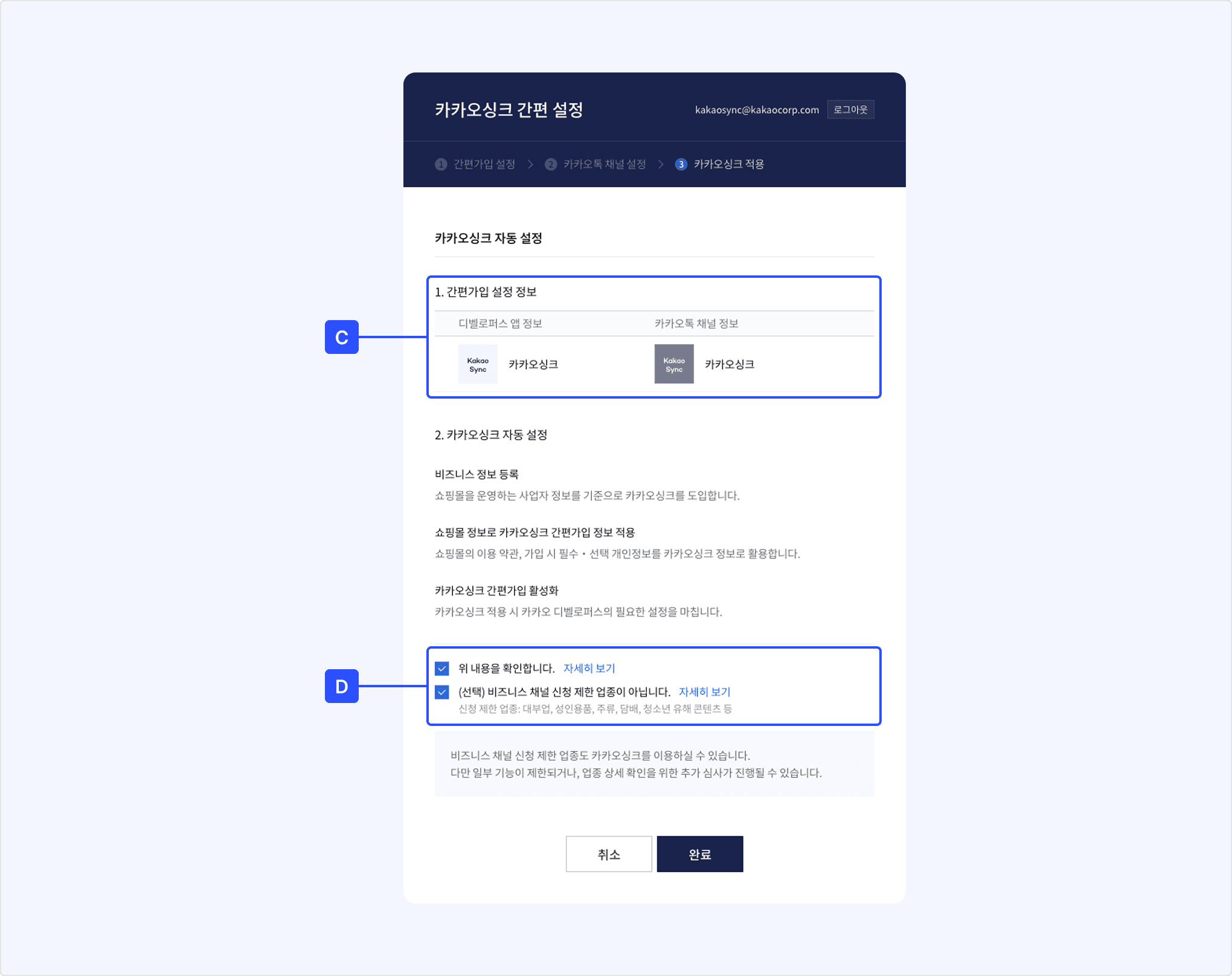 [C] 카카오싱크를 적용할 쇼핑몰 정보(카카오디벨로퍼스 앱 정보)와 카카오톡 채널 정보가 올바른지 확인합니다. 앱 혹은 채널 선택이 잘못된 경우, [취소] 버튼을 눌러 이전 단계로 돌아가 선택 정보를 수정하거나, 신규 앱 혹은 채널을 생성할 수 있습니다.