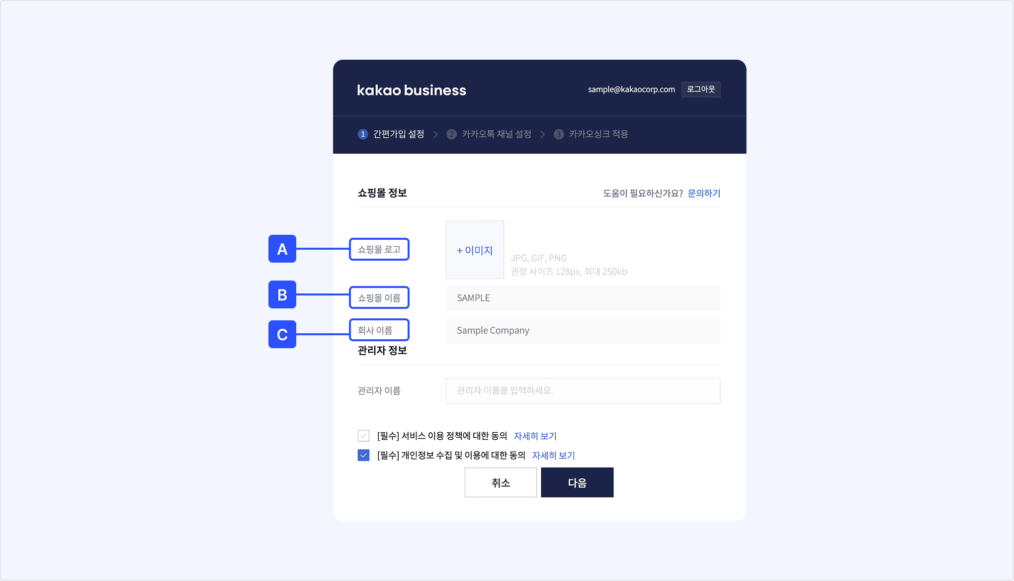 [A] 쇼핑몰 로고: 가이드에 맞춰 쇼핑몰 로고를 등록합니다. 가급적 쇼핑몰의 대표 이미지를 사용합니다.