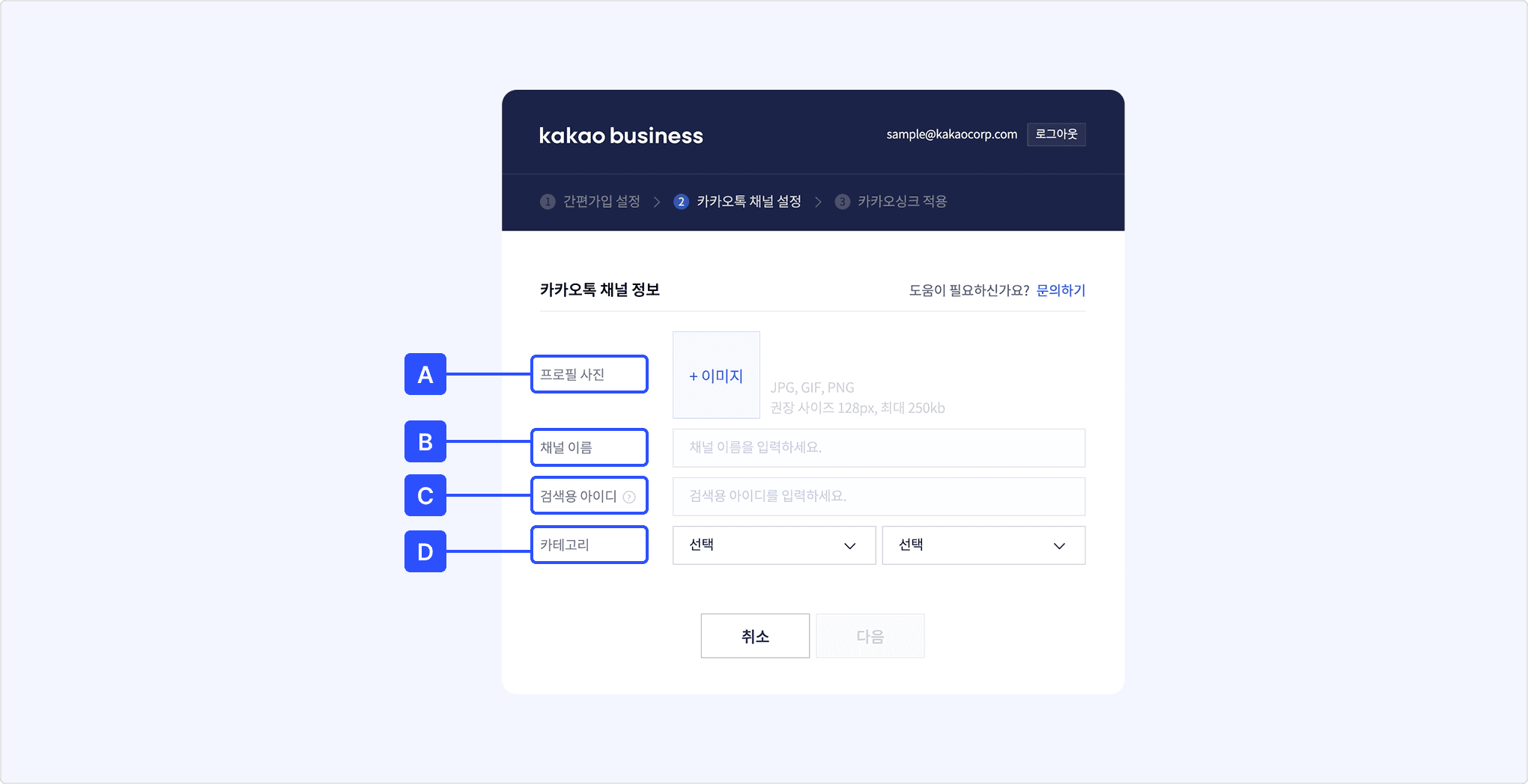 기존에 운영 중인 카카오톡 채널이 없거나, [B][신규 채널 생성하기] 버튼을 클릭한 경우 아래 화면이 나타납니다.