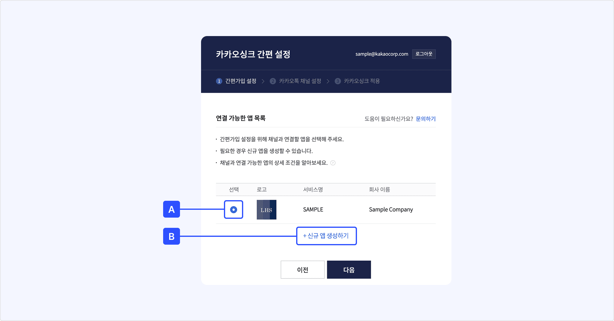[A] 카카오싱크를 적용할 쇼핑몰 정보를 선택하고 아래 단계로 이동합니다.