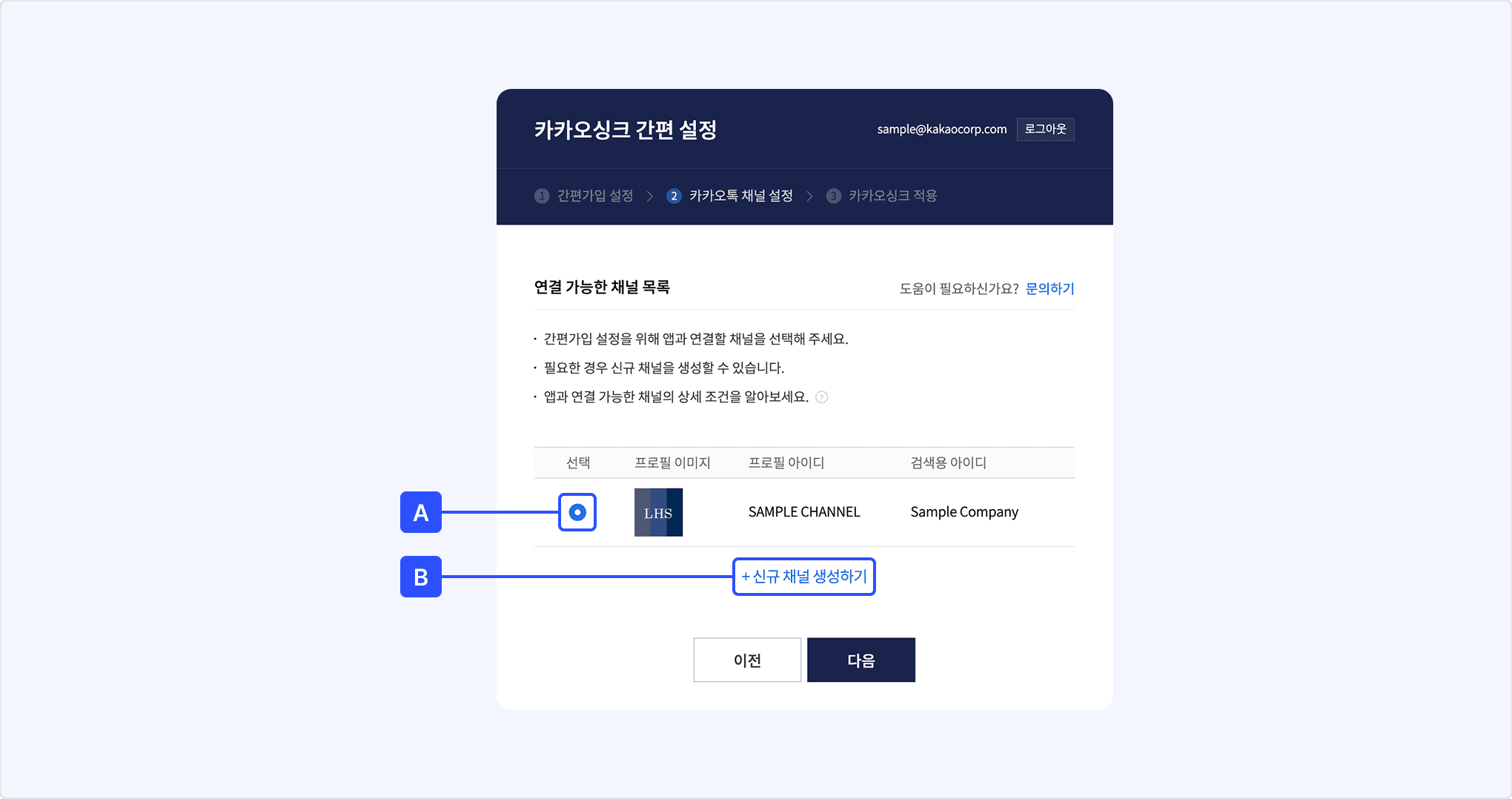 카카오 간편가입 동의 화면에 노출할 채널을 선택하는 단계입니다. 선택된 채널 정보는 간편가입 동의 화면에 그대로 노출 되므로, 채널의 정보가 정확히 설정되어 있는지 확인합니다.