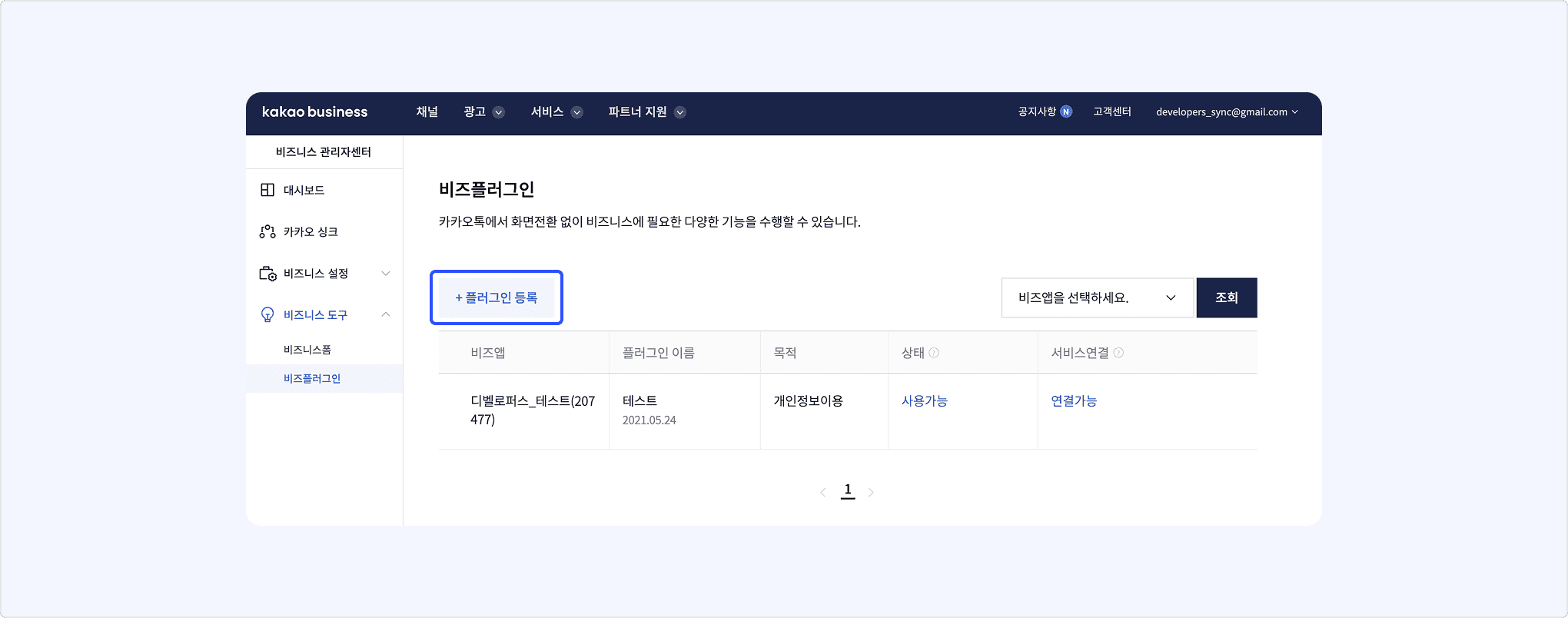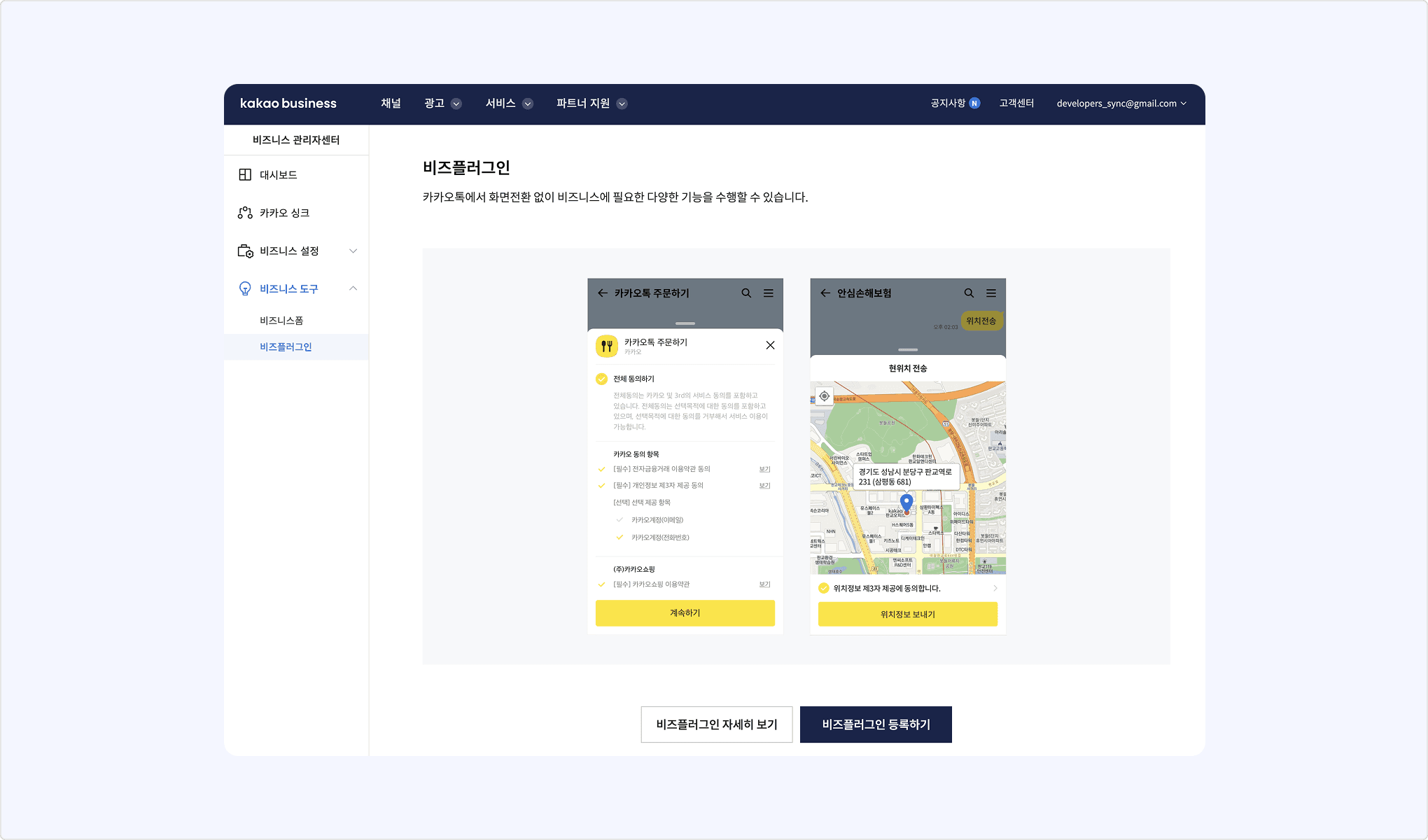 이후 카카오비즈니스의 [서비스/도구] > [비즈도구] > [비즈플러그인]에서 등록한 싱크 플러그인의 ID와 상세 정보를 확인하고 수정할 수 있습니다.